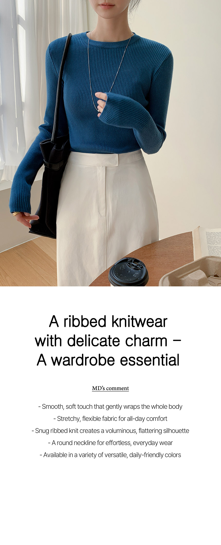 This knitwear features a soft, smooth touch that gently wraps the body, with a voluminous silhouette shaped by a structured ribbed weave. Available in a range of versatile colors, it’s perfect for everyday wear.
