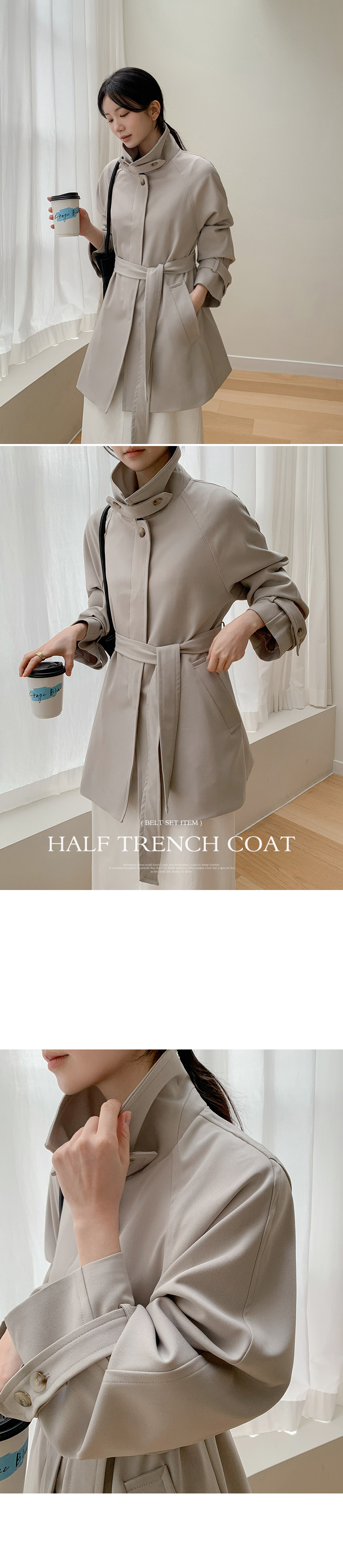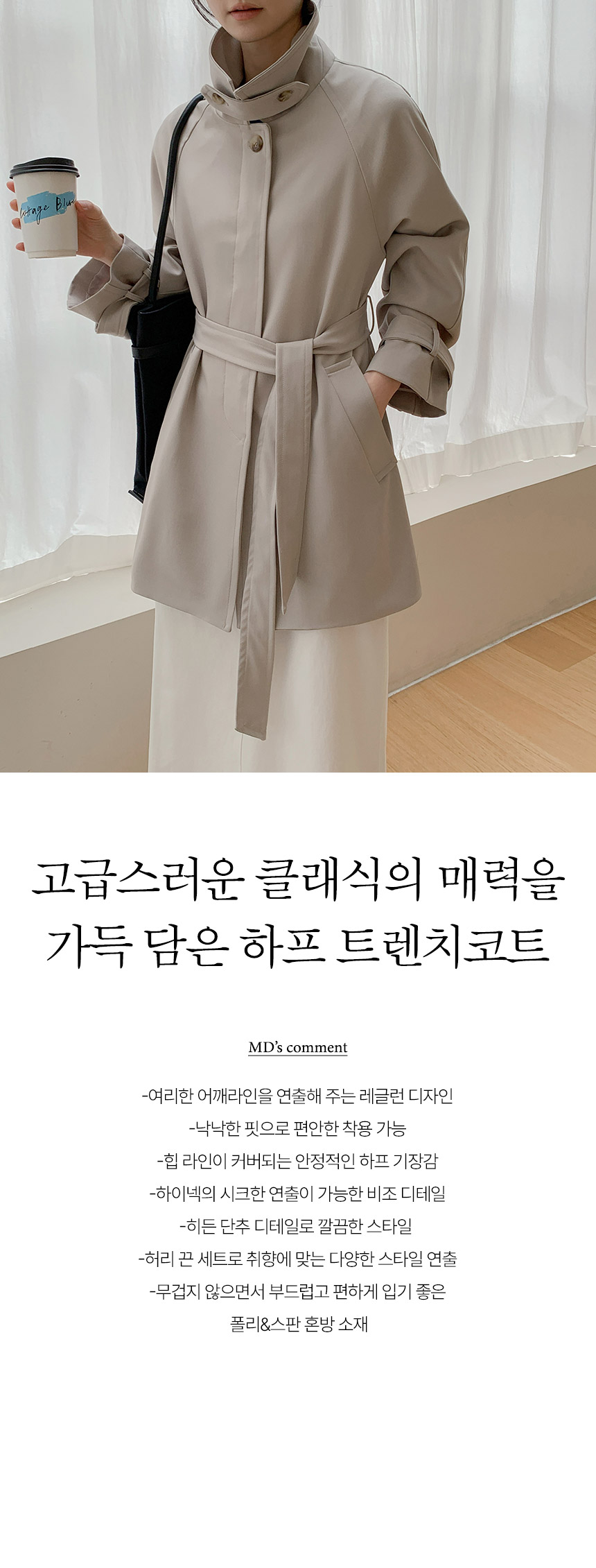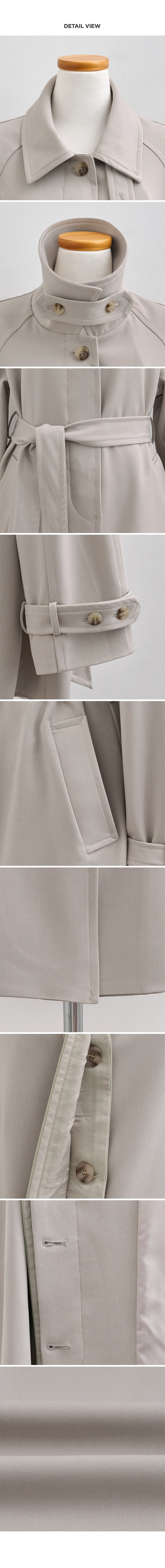 This trench coat features a raglan design that creates a sleek, slender shoulder line. Its stable half-length falls over the hips, while the chic high neckline and hidden button details offer a polished, streamlined look.