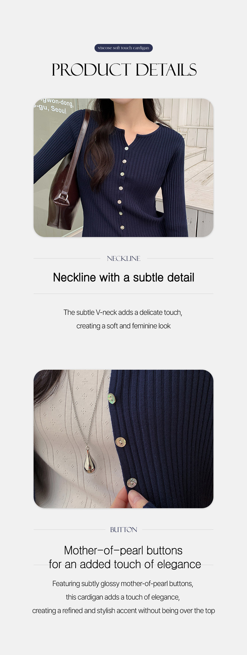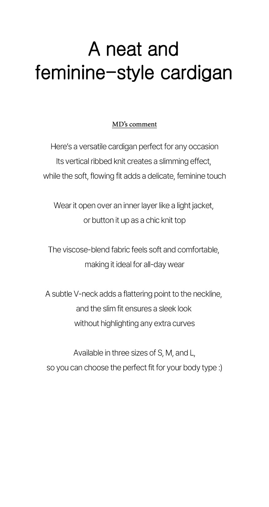 This slim-fit cardigan features a fine ribbed weave for a sleek silhouette. The subtle V-neck adds a touch of elegance, while the viscose blend ensures a soft and comfortable feel.
