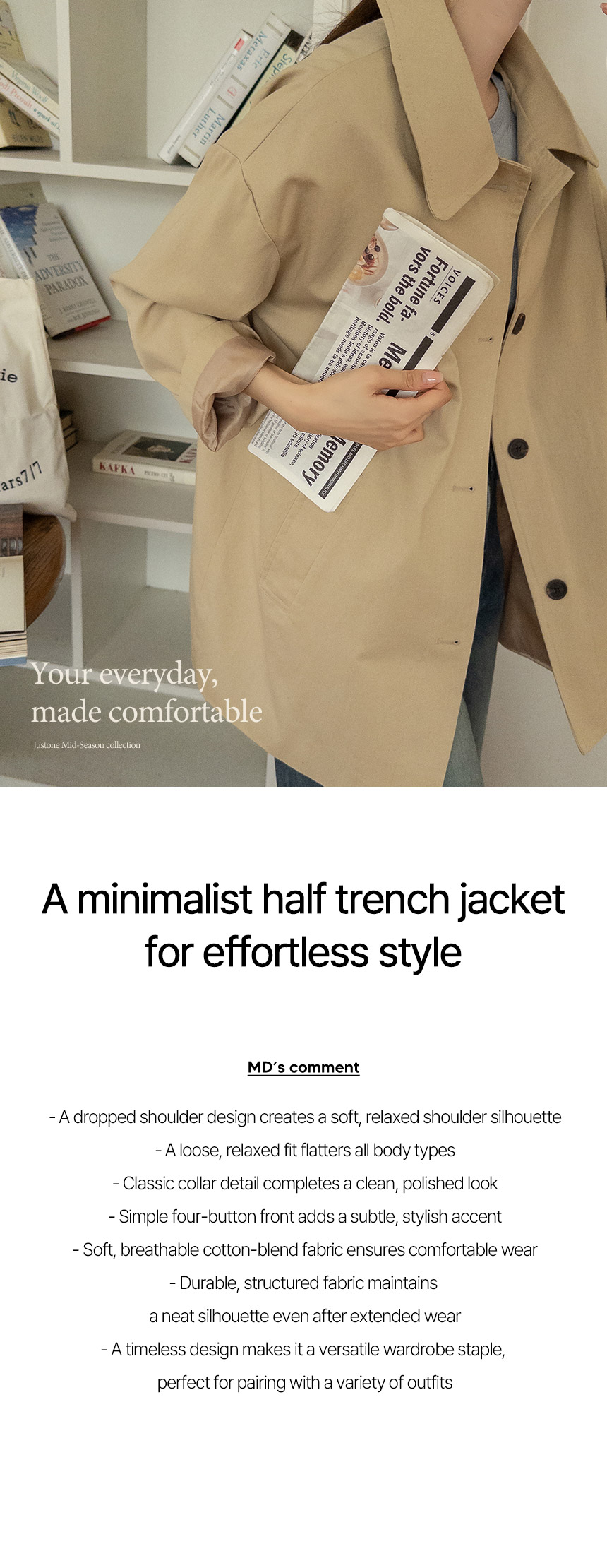 This half trench coat is perfect for the transitional seasons. Its structured fabric creates a sleek, long-lasting silhouette, while the classic design makes it easy to style with a variety of looks.