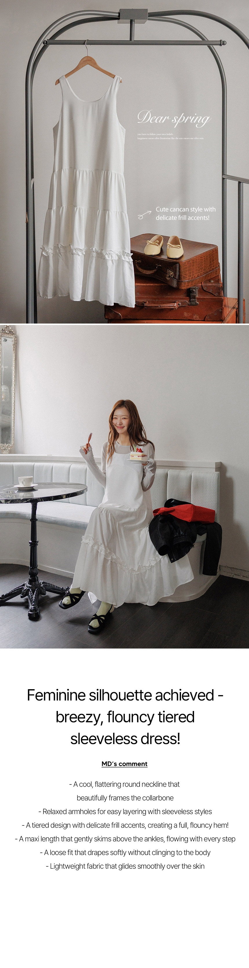 The maxi-length cancan dress features lovely frill details that create a soft, feminine mood. Made from smooth, lightweight fabric, it forms a graceful silhouette that gently flutters with every step.