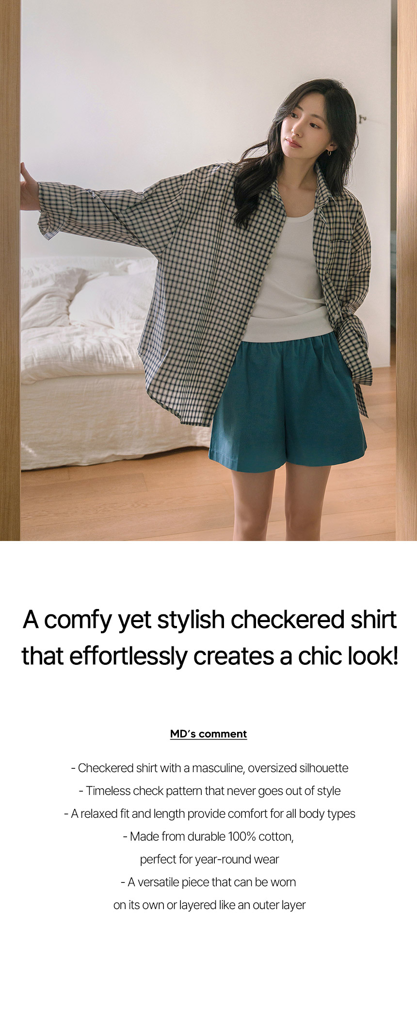 This checkered shirt features a stylish, masculine oversized silhouette. Its hip-length design and relaxed fit make it comfortable for all body types. Perfect worn on its own or layered as a lightweight outer layer during transitional seasons.