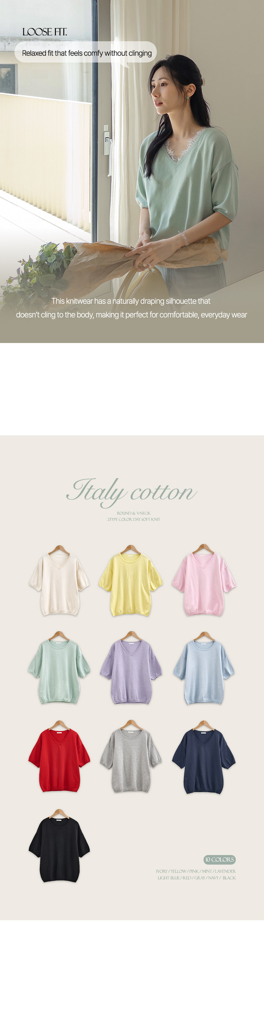 This refreshing short-sleeve knitwear is perfect for spring and summer. Its loose, relaxed fit ensures comfort for everyone, while the lightweight, soft Italian cotton yarn creates vibrant, beautiful colors.