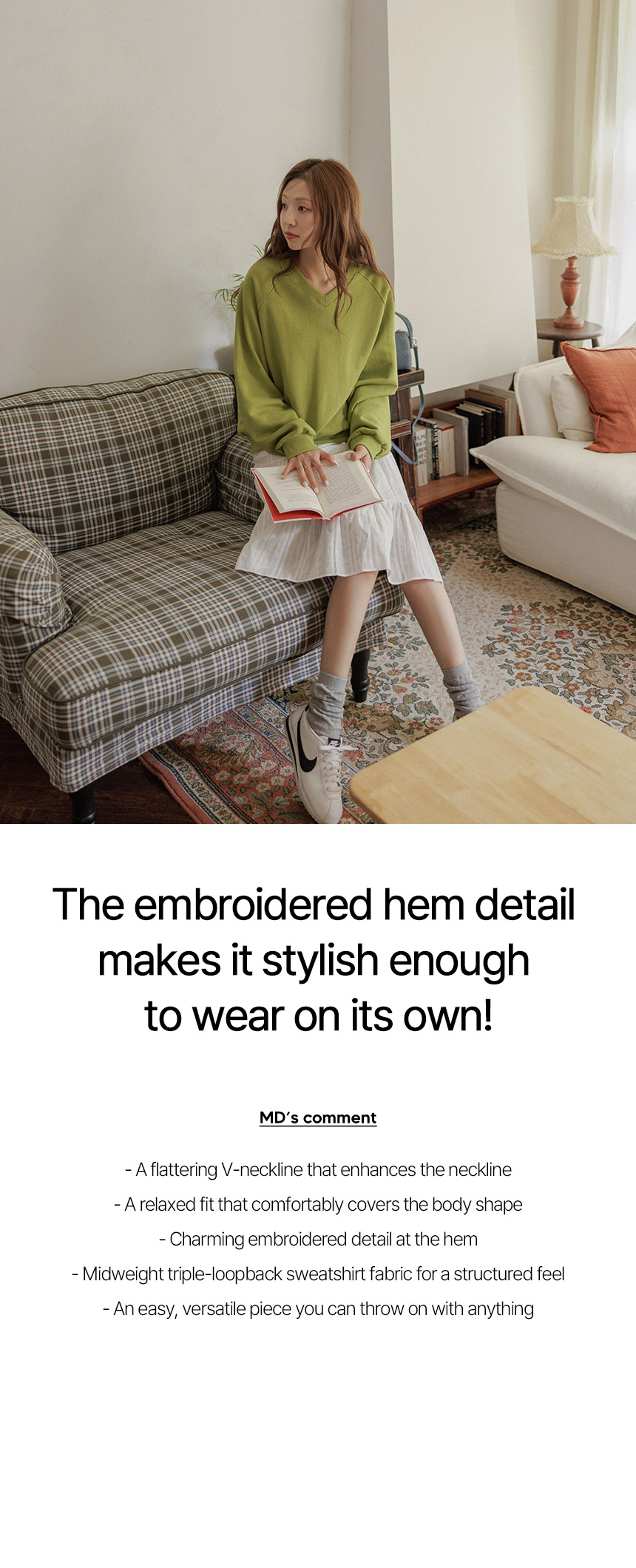 This V-neck sweatshirt features a delicate embroidered detail at the hem. With its relaxed fit, it’s perfect for comfortable wear throughout the transitional season.