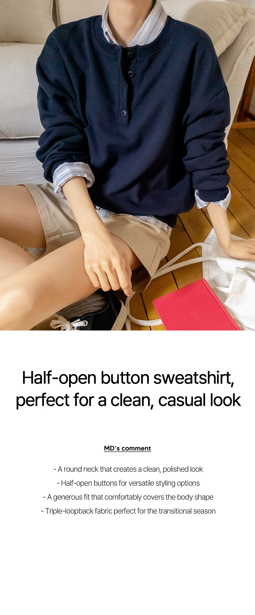 This sweatshirt features a half-button design for easy layering. With a comfortable round neckline and a relaxed fit, it’s perfect for everyday wear. Pair it with a shirt for a stylish, layered look.