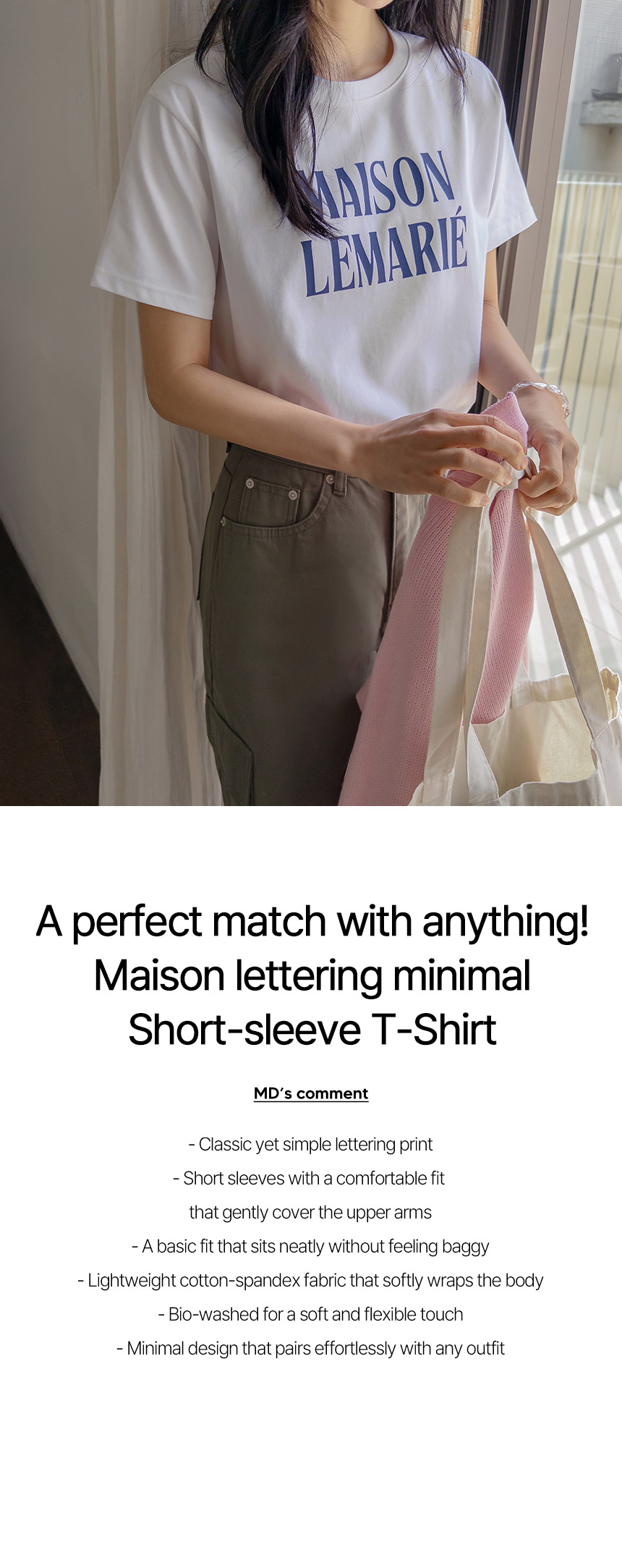 This neat, basic-fit T-shirt is perfect for layering under outerwear, featuring simple yet classic lettering as its key detail. Made from bio-washed cotton-spandex fabric, it feels soft against the skin and offers excellent comfort with a flexible fit.