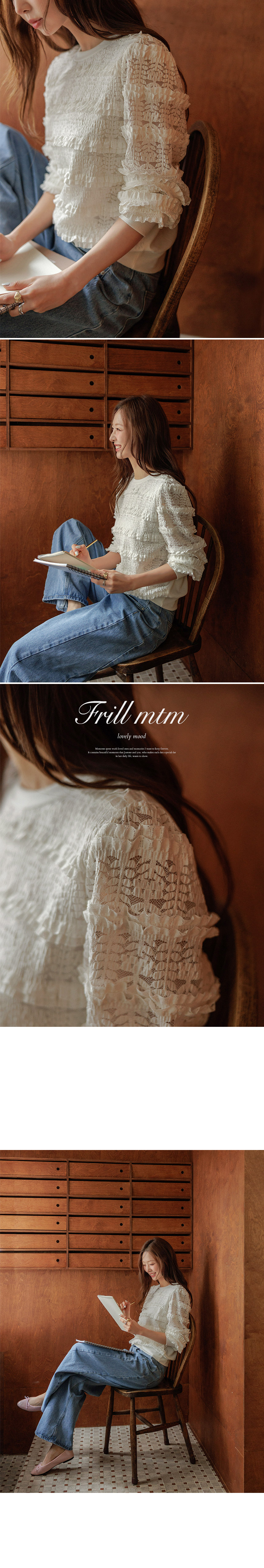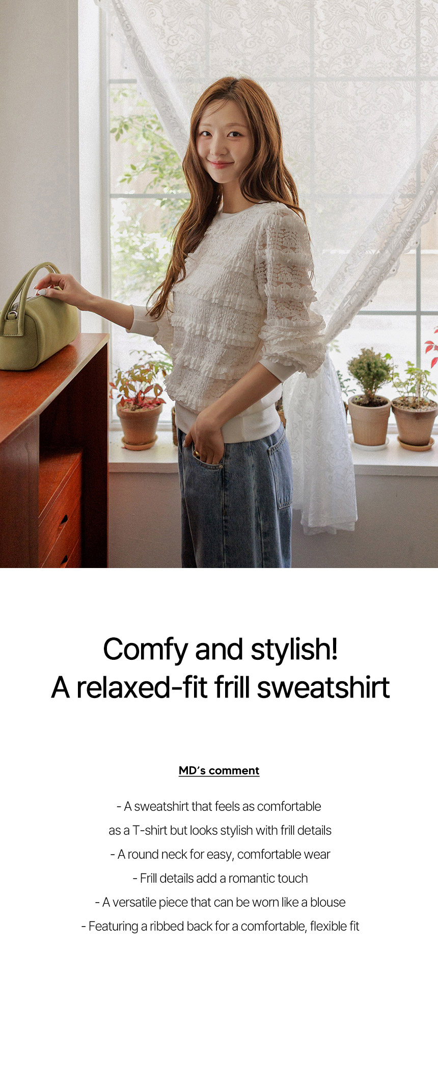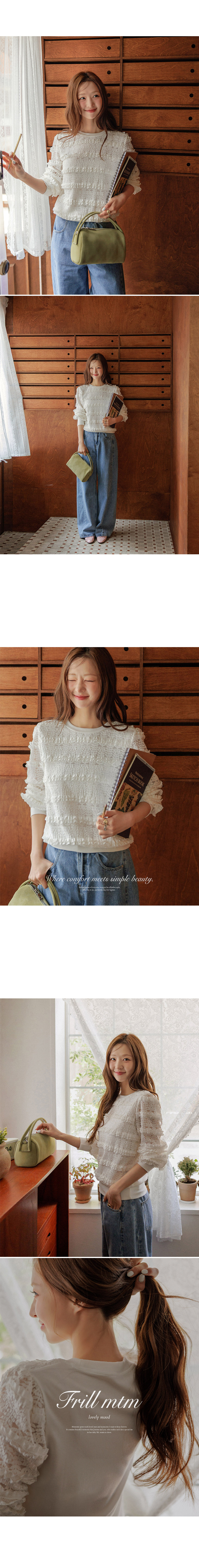 This sweatshirt combines a comfortable, T-shirt-like feel with a lovely front design accented by frill details. Made from high-quality ribbed spandex fabric, it offers both softness and flexibility. An easy piece that creates an effortlessly cute look when paired with jeans.