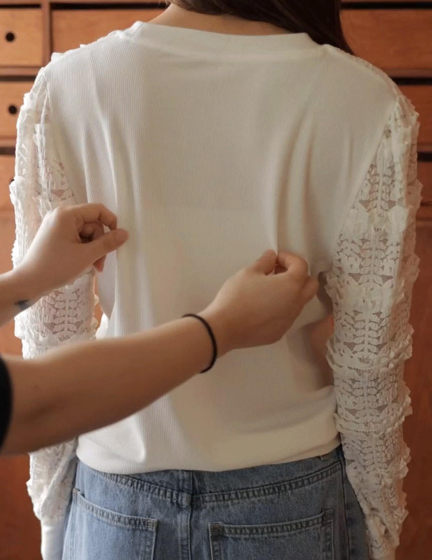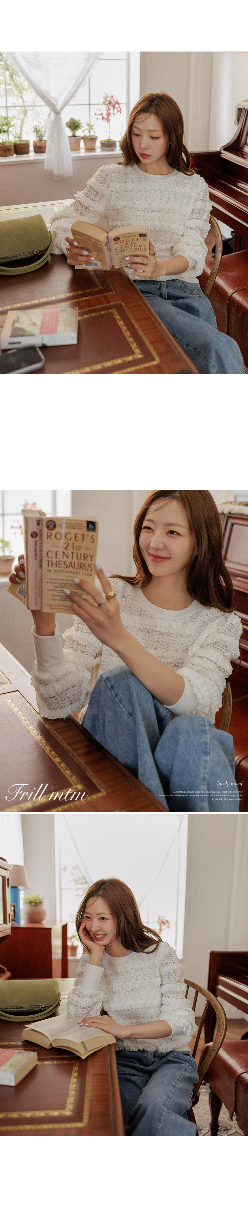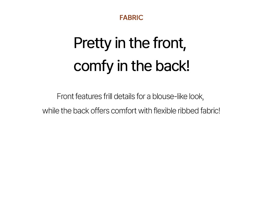This sweatshirt combines a comfortable, T-shirt-like feel with a lovely front design accented by frill details. Made from high-quality ribbed spandex fabric, it offers both softness and flexibility. An easy piece that creates an effortlessly cute look when paired with jeans.
