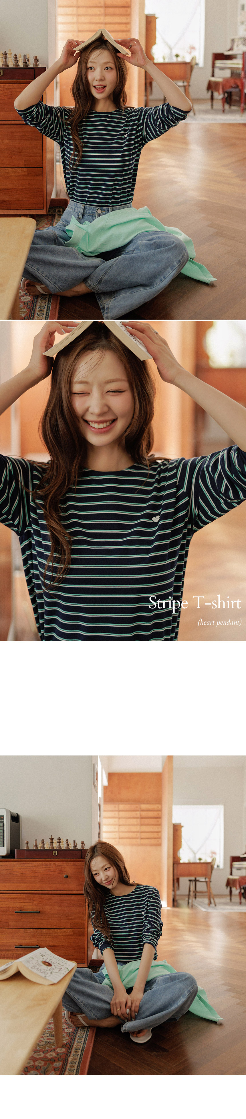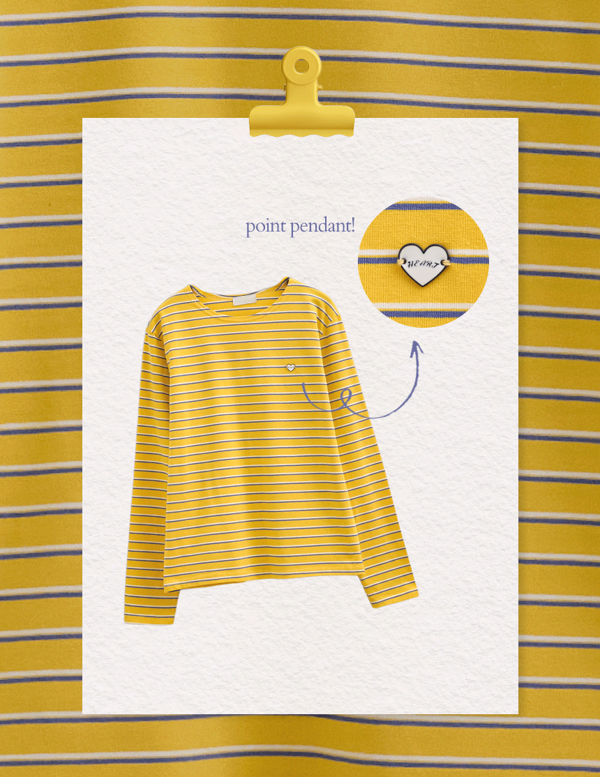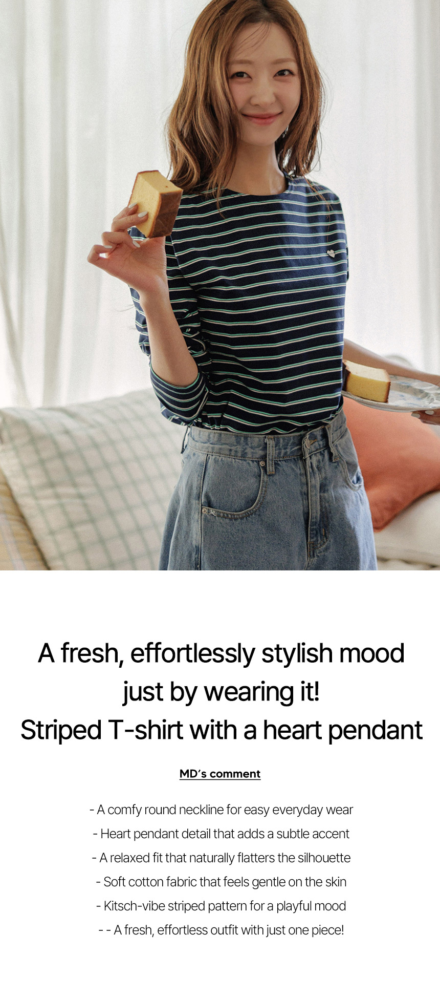 This striped tee features a charming colorful combination with a small heart pendant as a focal point. It is a T-shirt that creates a lively daily look just by casually tossing it over jeans!