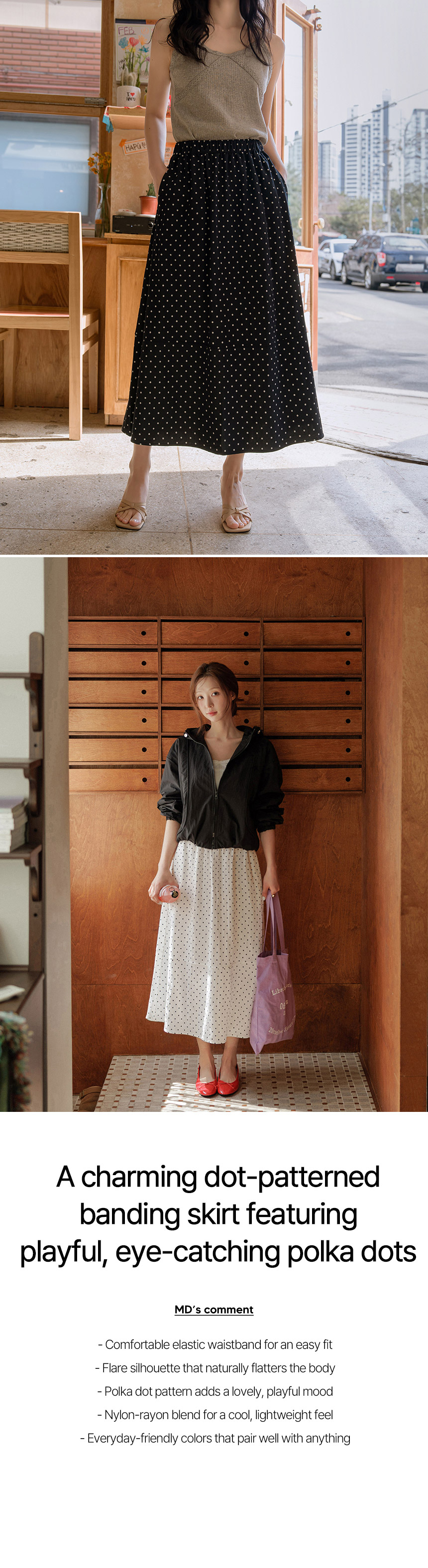 This flare skirt features a comfortable elastic waistband and a delicate polka dot pattern, making it perfect for both everyday wear and creating a feminine look.