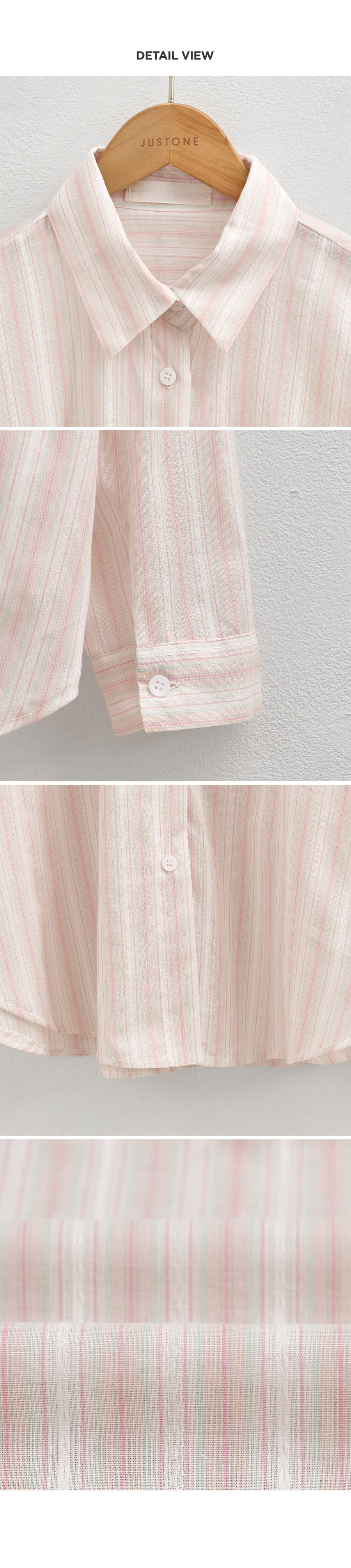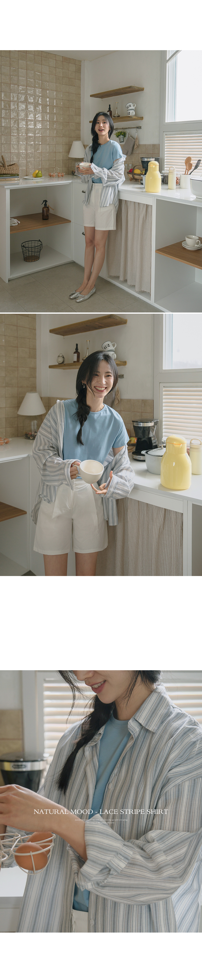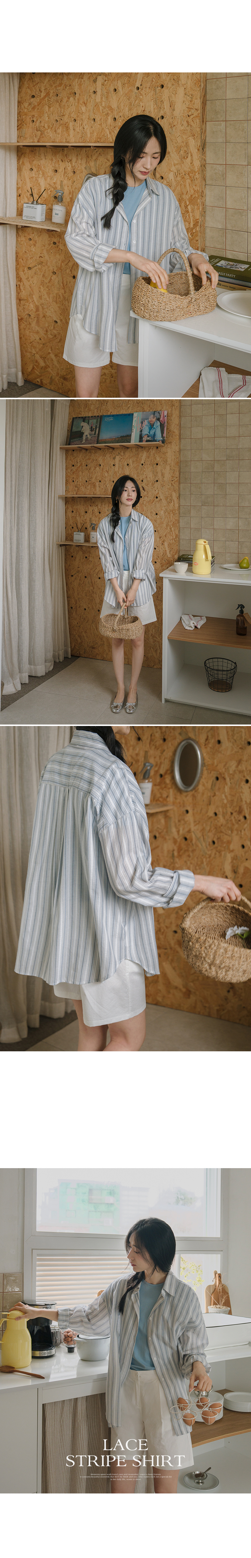 This shirt features a stylish look with delicate lace details added to a bright striped pattern. The relaxed fit creates a soft, graceful silhouette, while the thin, lightweight cotton fabric ensures comfortable wear even in summer.