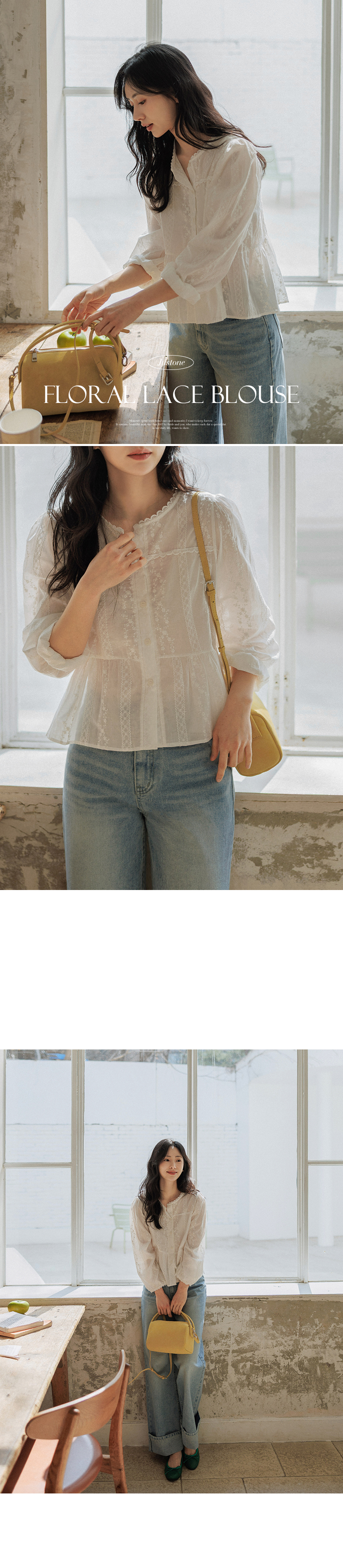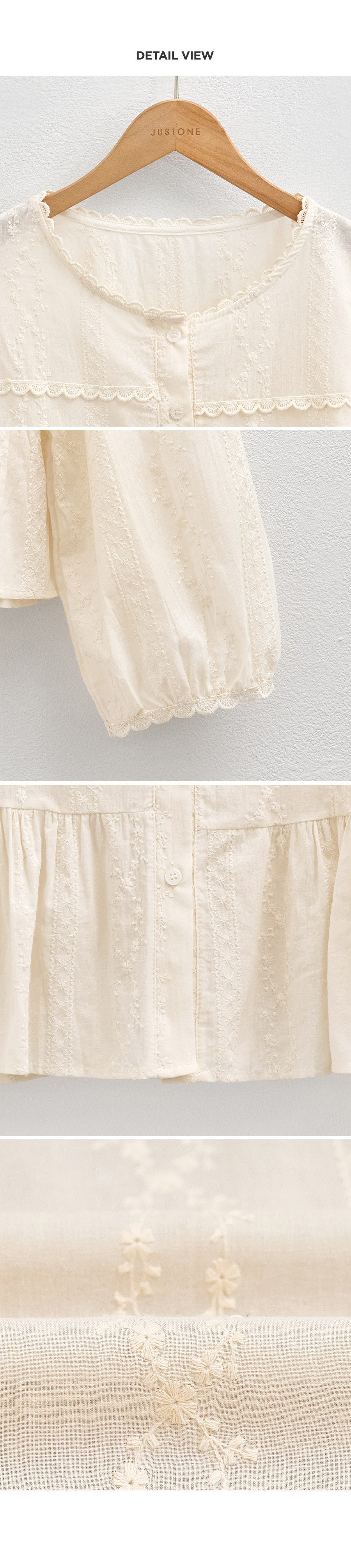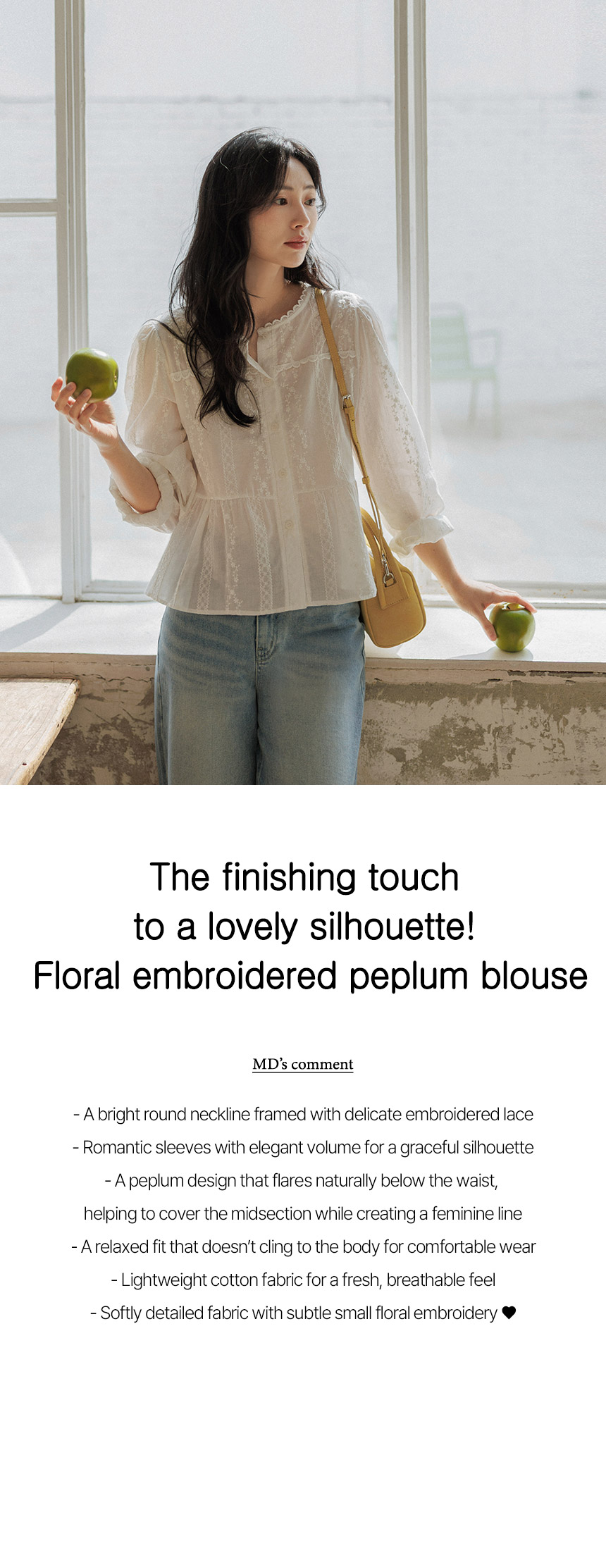 This blouse features delicate small floral embroidery on lightweight cotton, creating a soft and lovely mood. The peplum design gently flares from the waist, offering comfortable coverage while enhancing a feminine silhouette.