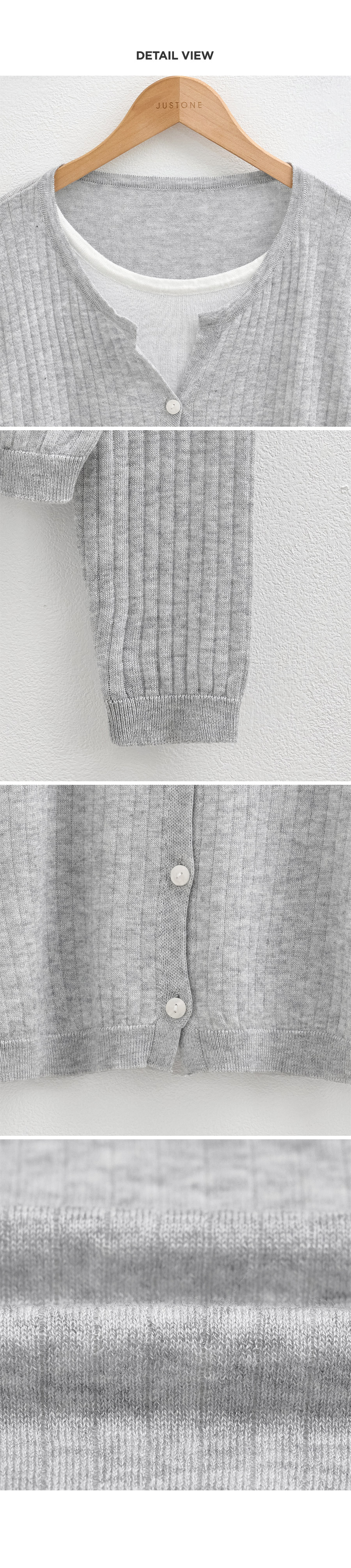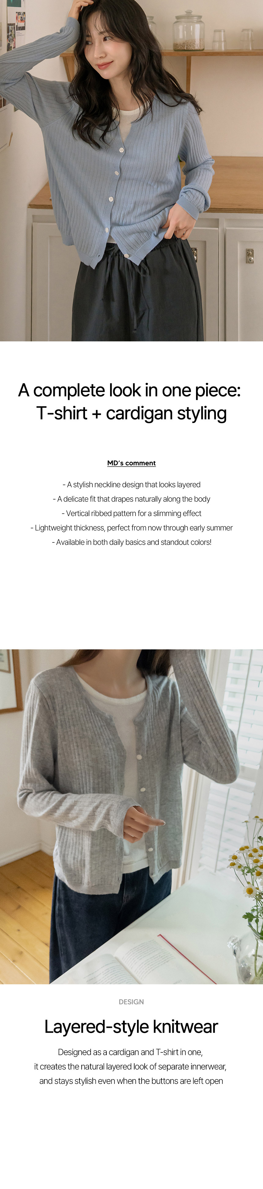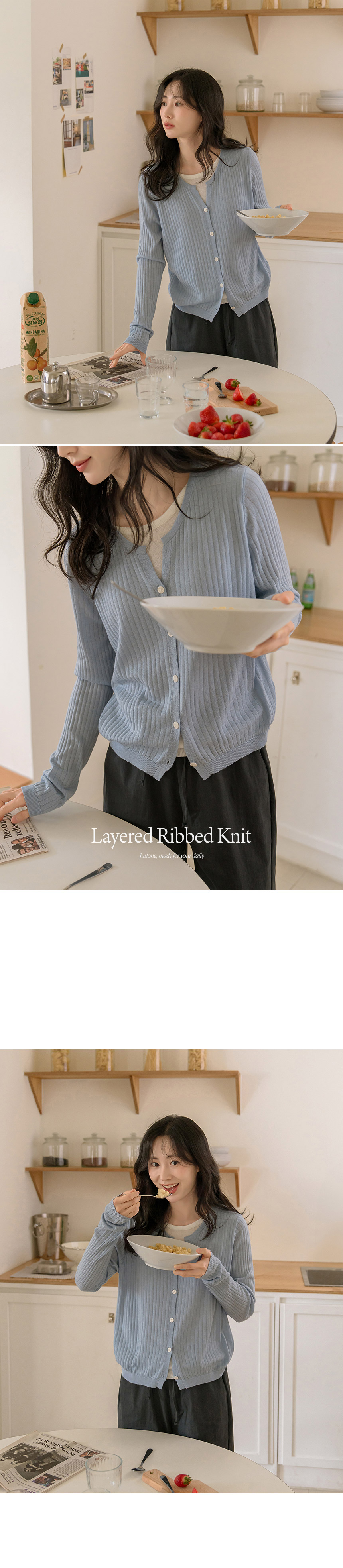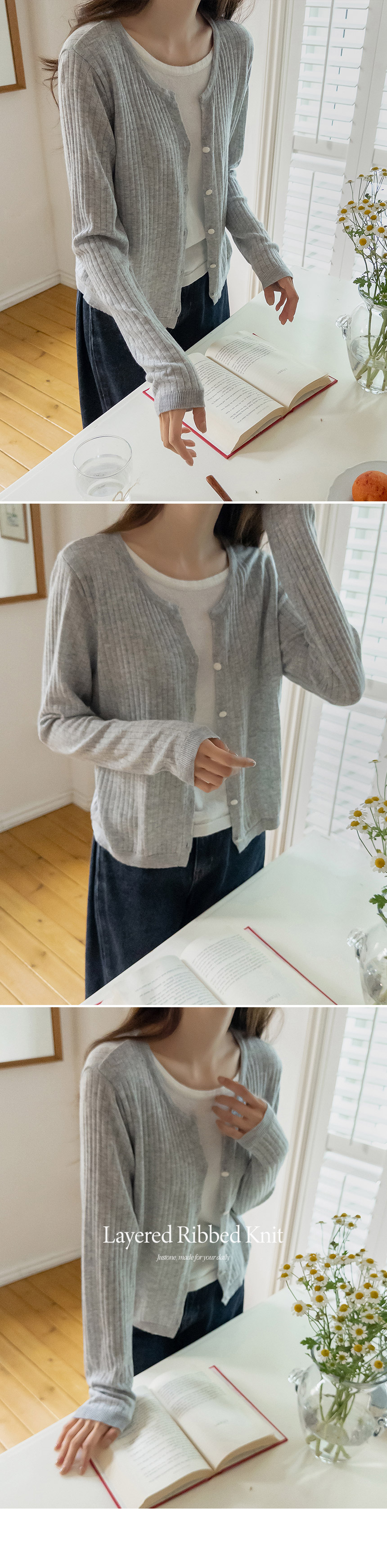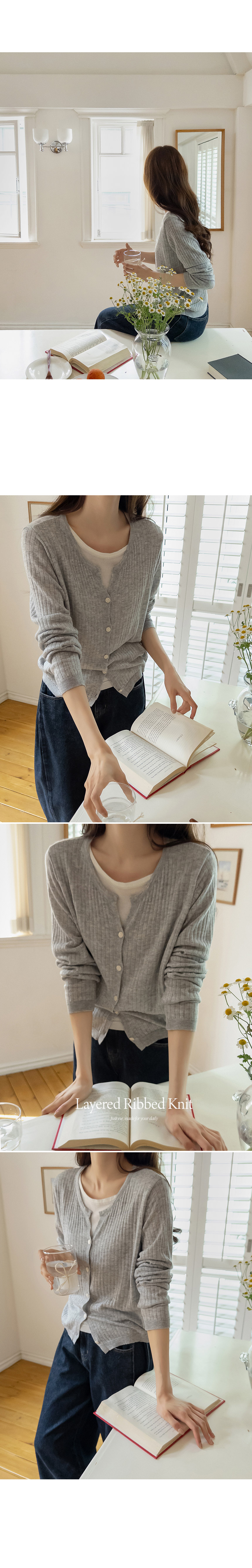 This is a ribbed knit that creates a delicate, soft mood. It features an attached front tank top, allowing you to wear it in a layered style. It also looks great styled open over the cardigan.