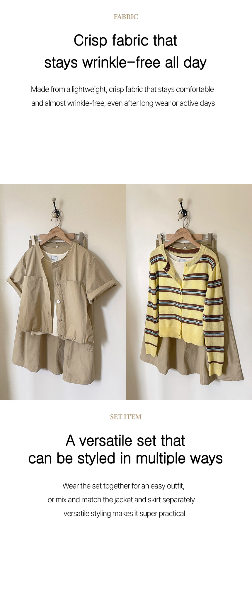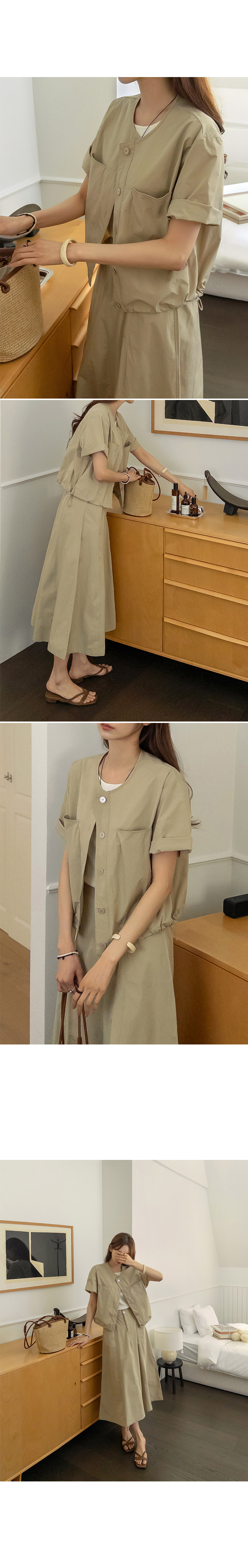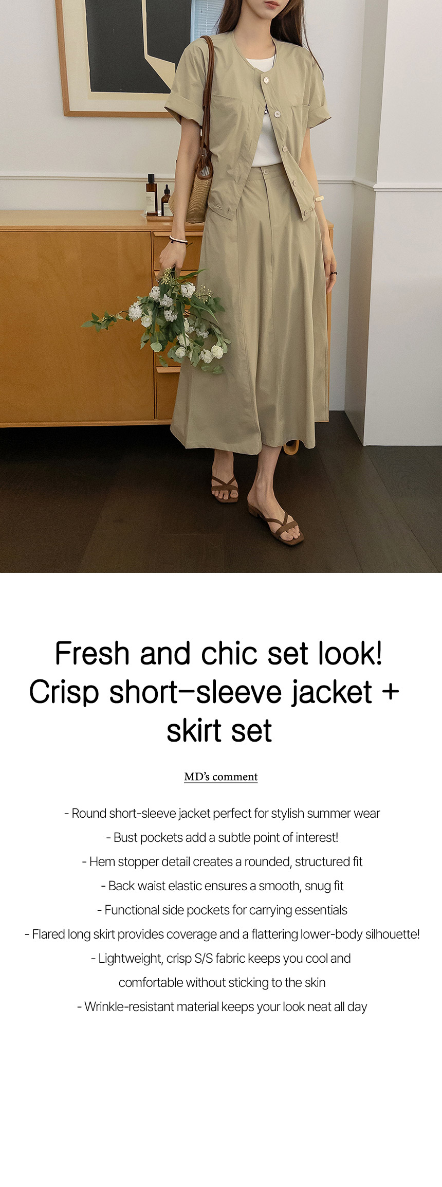 This jacket and skirt set offers a fresh yet chic coordinated look. Crafted from lightweight, crisp fabric, it’s wrinkle-resistant and drapes comfortably without clinging. Versatile and practical, each piece can be styled together or worn separately for multiple outfit options.