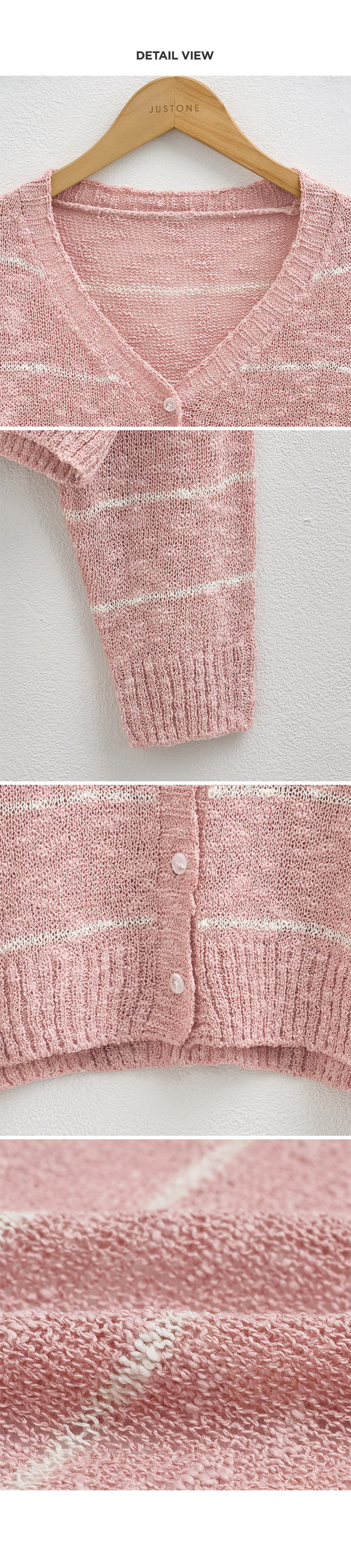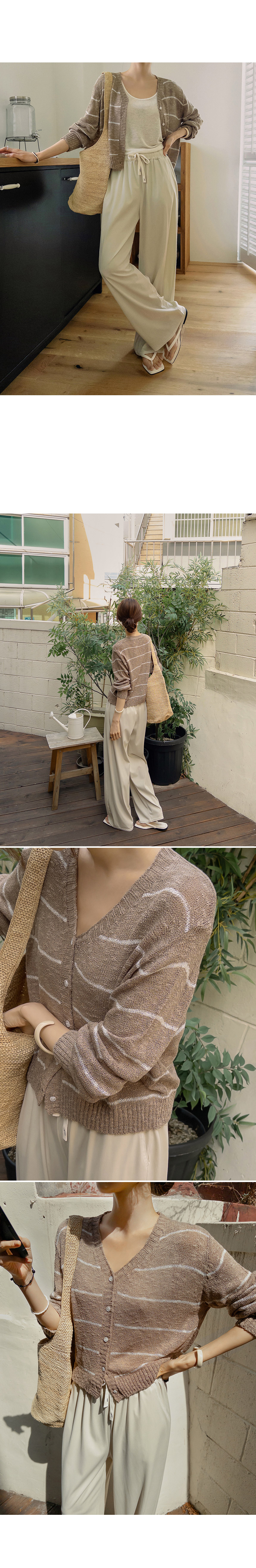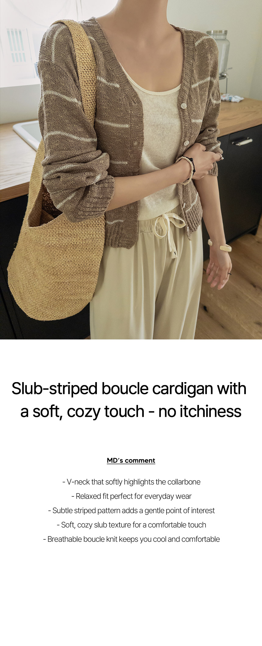 This boucle cardigan features a cool, soft slub texture for comfortable, non-itchy wear. Finished with thin stripes, it adds a subtle accent to elevate your look.