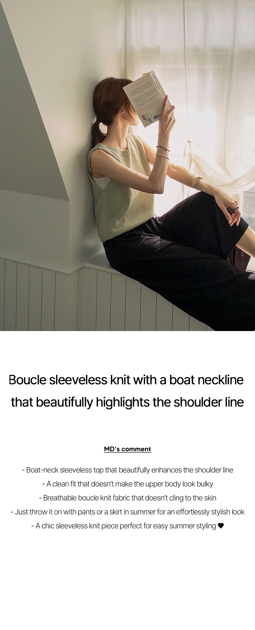 This boat-neck sleeveless top accentuates the shoulder structure, beautifully highlighting your shoulder line. Made from boucle knitwear, it is breathable as it does not cling to the body, and the neat fit ensures the upper body does not look bulky!