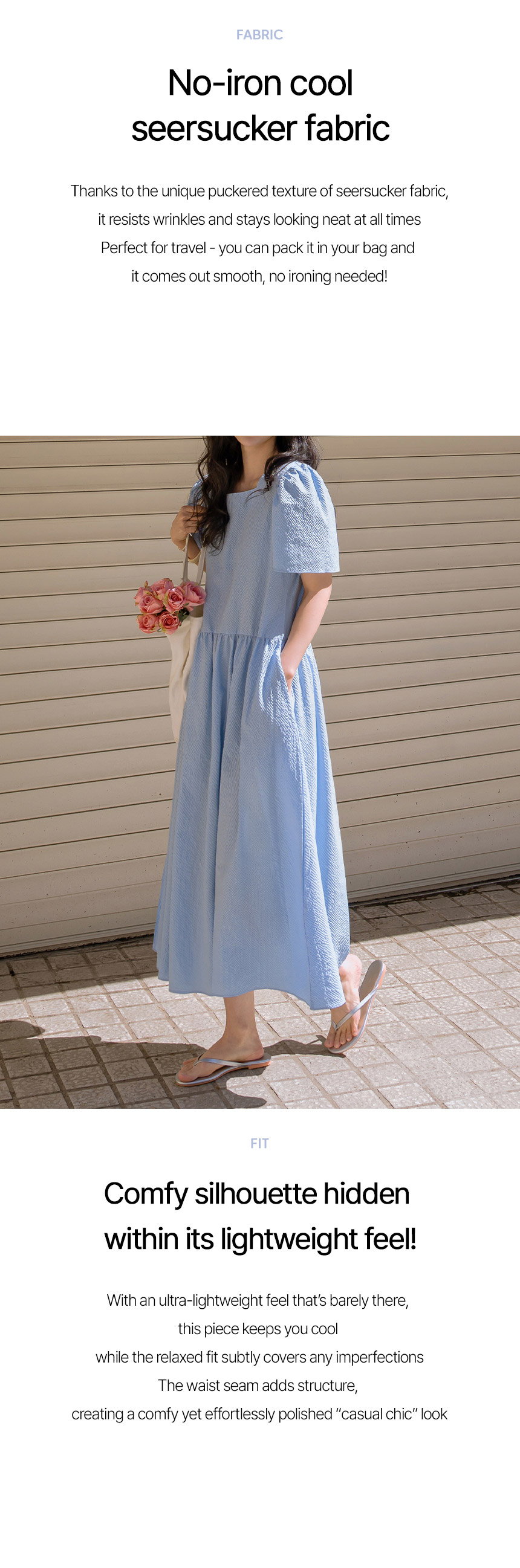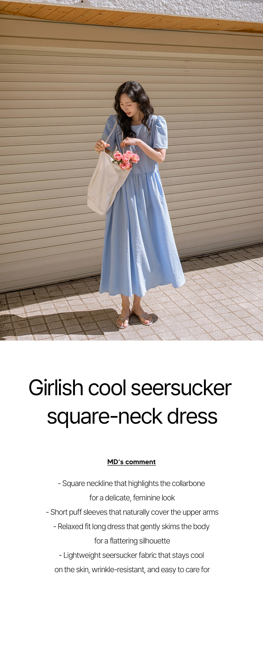 This puff-sleeve dress exudes a girlish charm with its delicate square neckline. Made from lightweight chiffon fabric, it offers a cool and wrinkle-resistant finish, making it perfect for vacations, travel, and everyday outings.