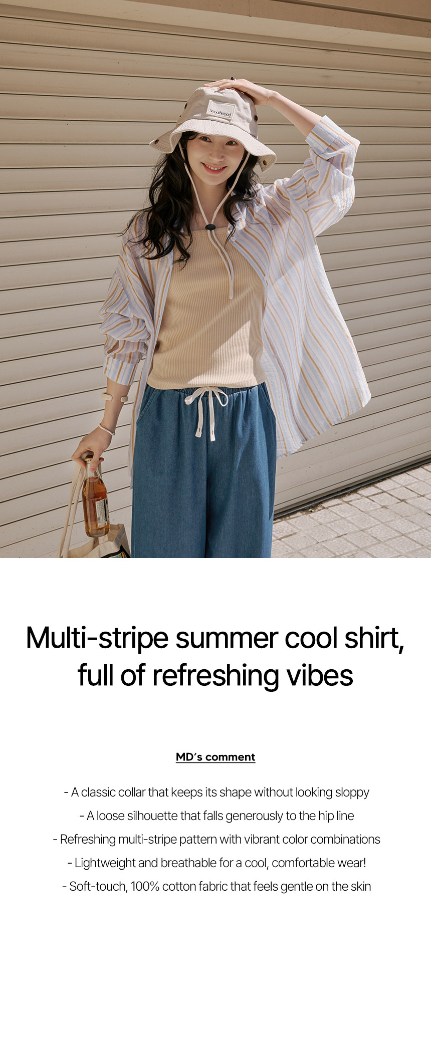 This shirt exudes a refreshing vibe with its bright color palette and multi-stripe pattern. Crafted from lightweight, breathable fabric, it keeps you cool, while the loose silhouette that drapes to the hip makes it perfect for layering as a light outerwear piece.