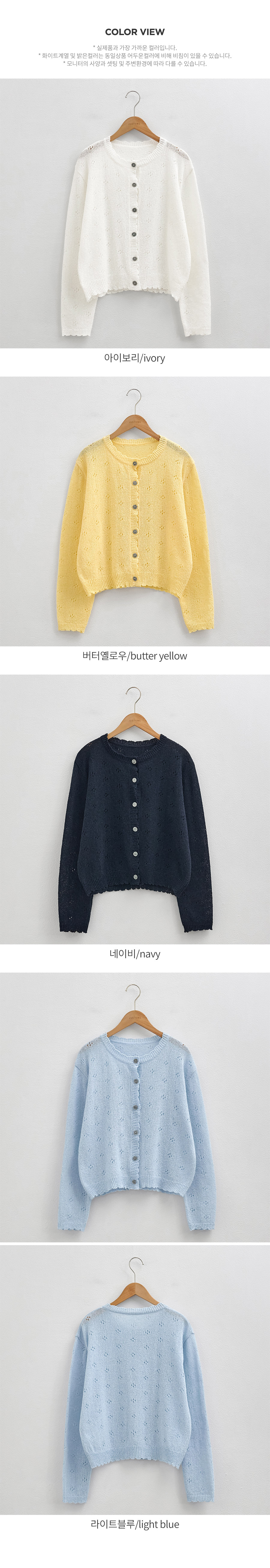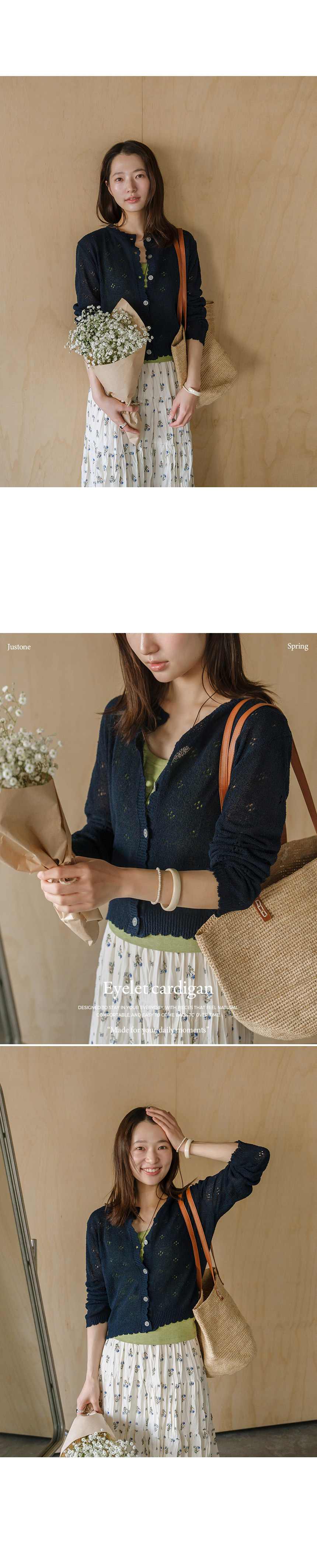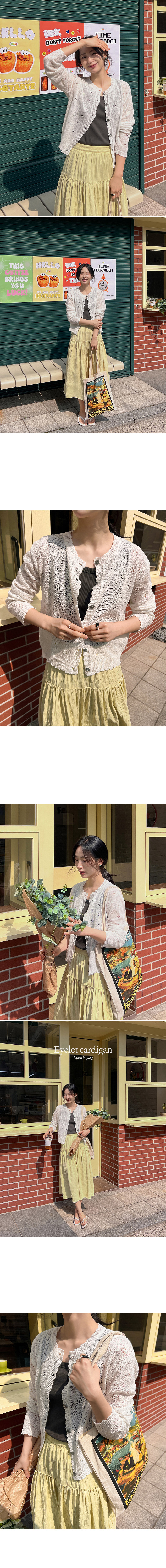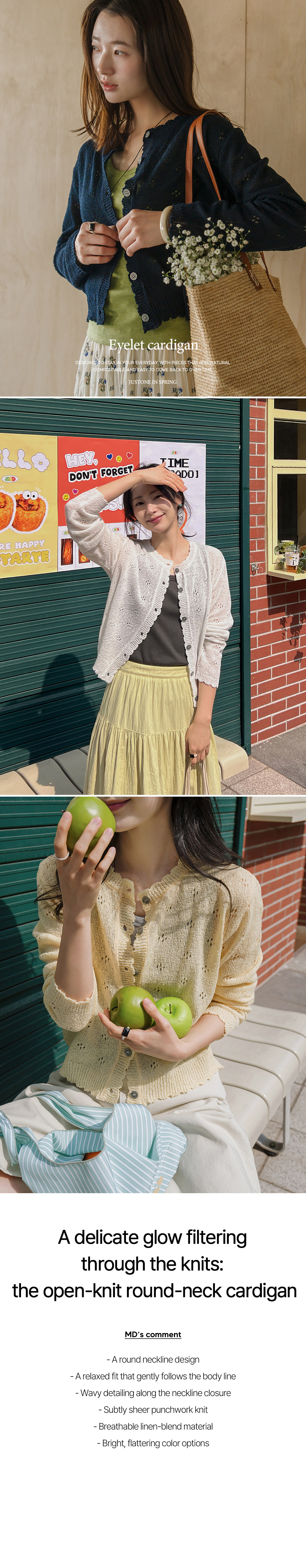 This round-neck cardigan features a breathable and textured knit with a delicate, airy feel. Versatile enough to pair with skirts or pants, it’s perfect for everyday wear.