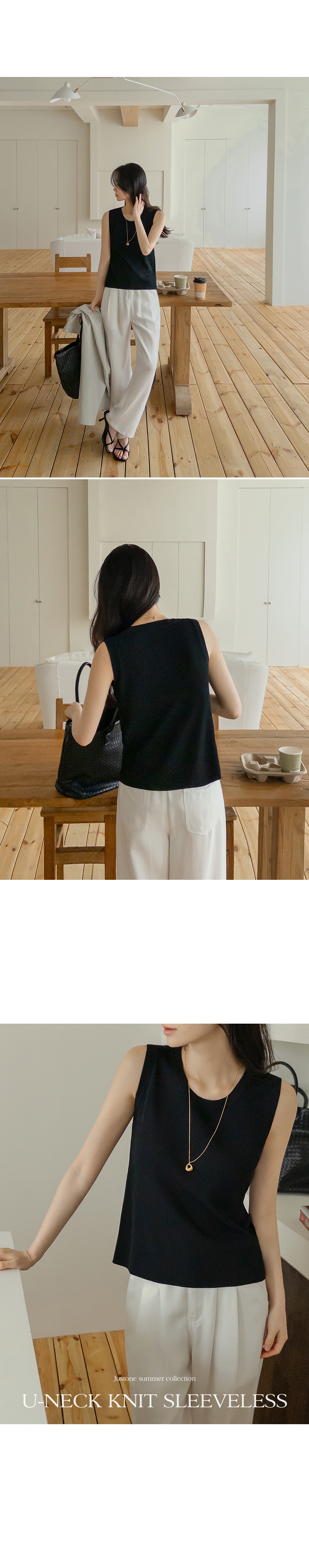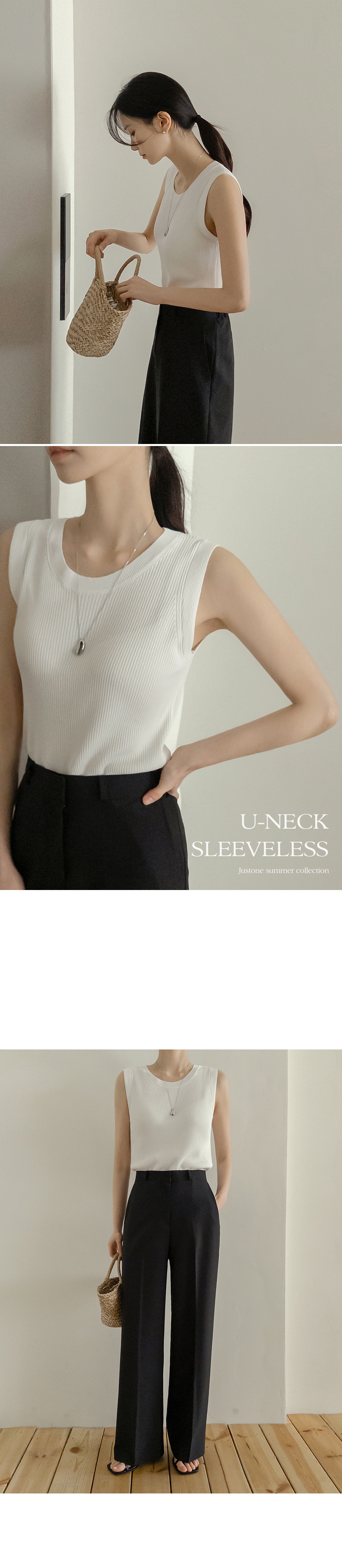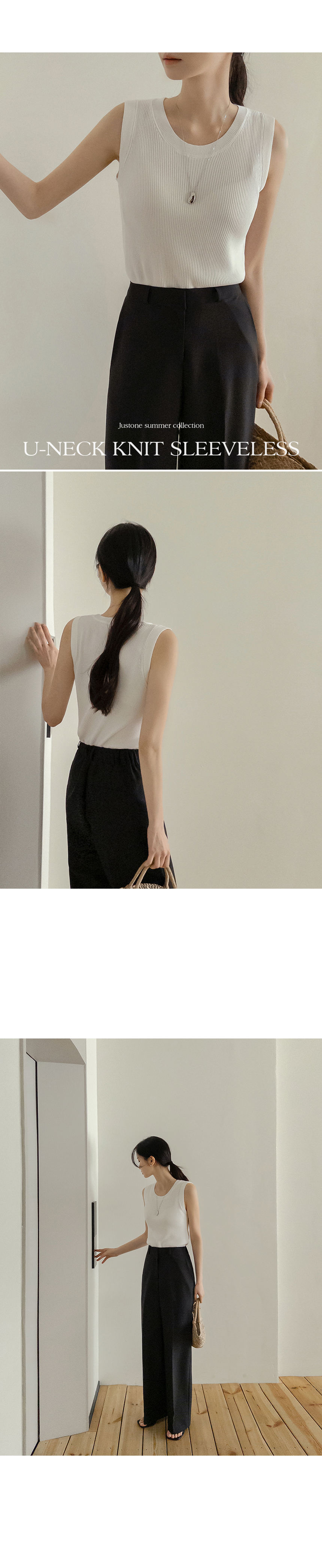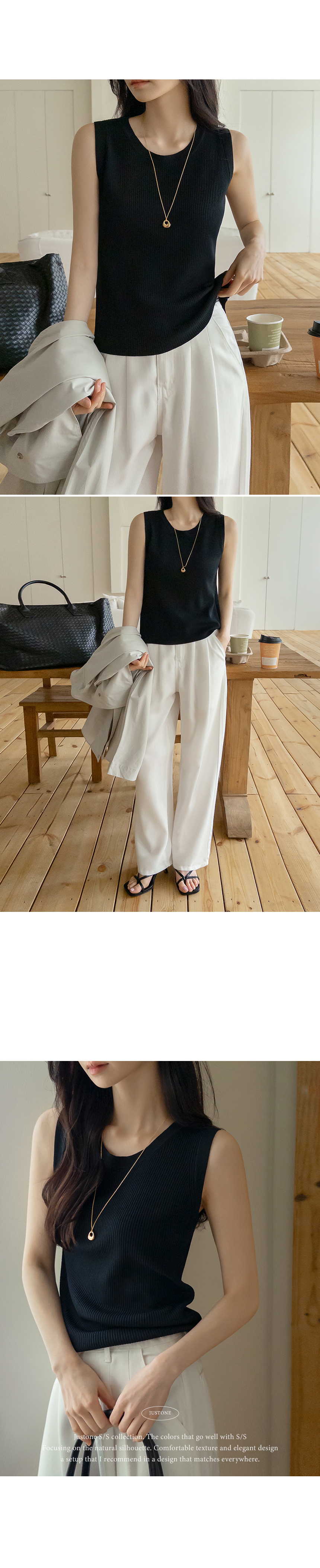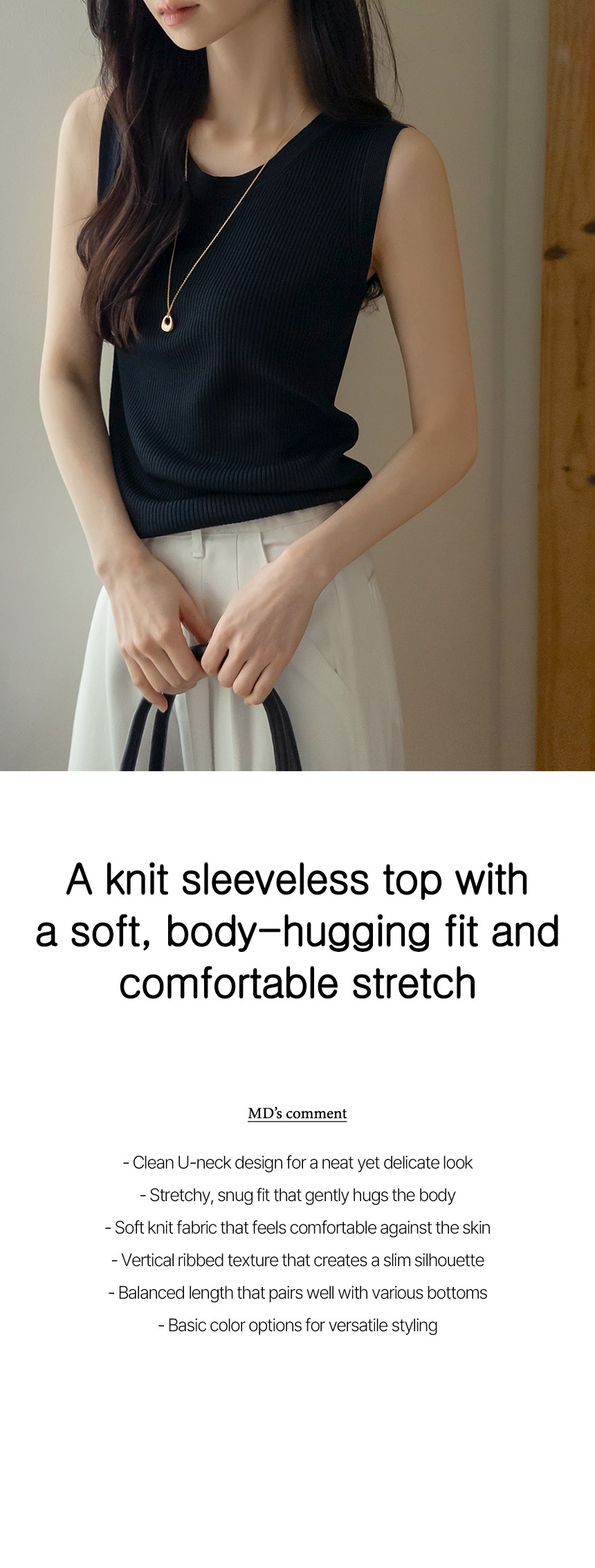This knit sleeveless top is perfect for creating a clean, polished look. The ribbed texture enhances a slim silhouette, while the flexible knit fabric ensures a comfortable fit without feeling restrictive.