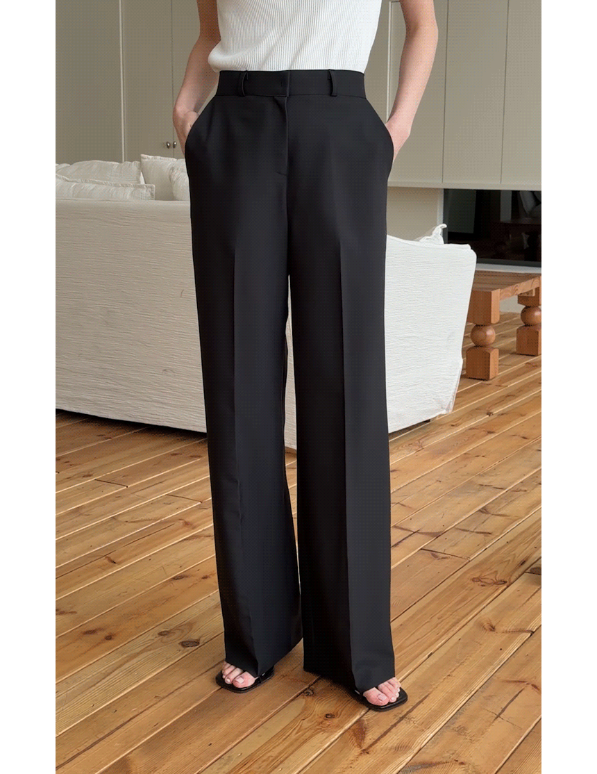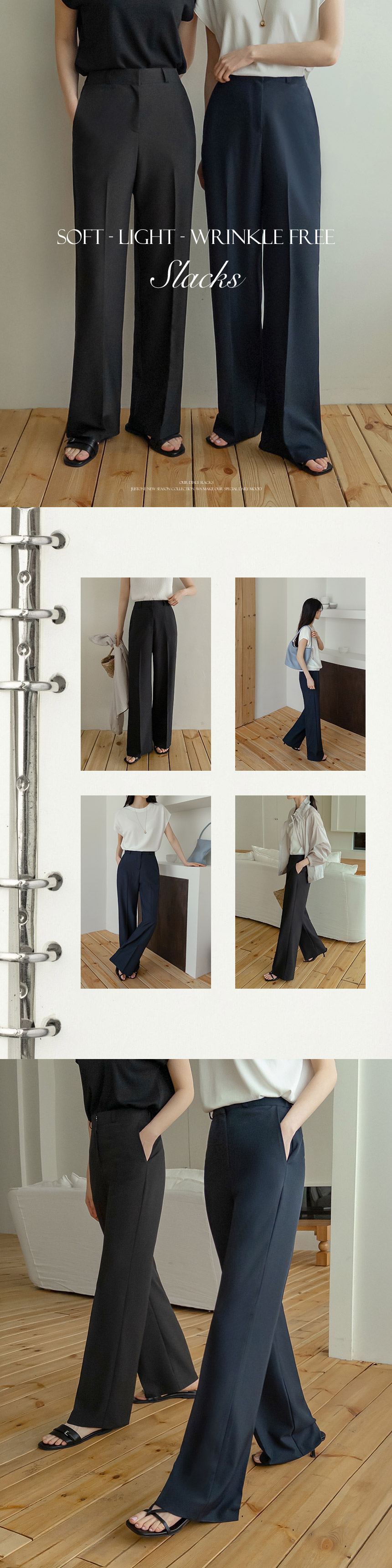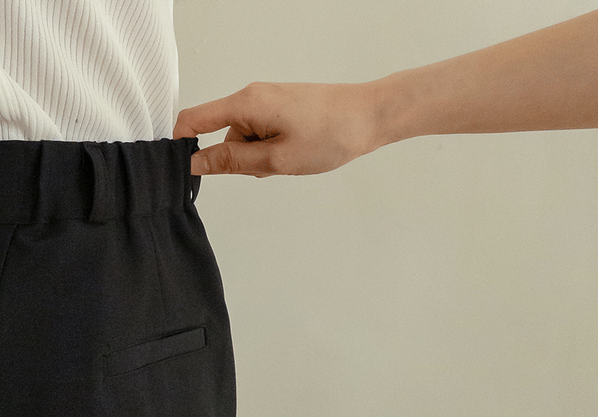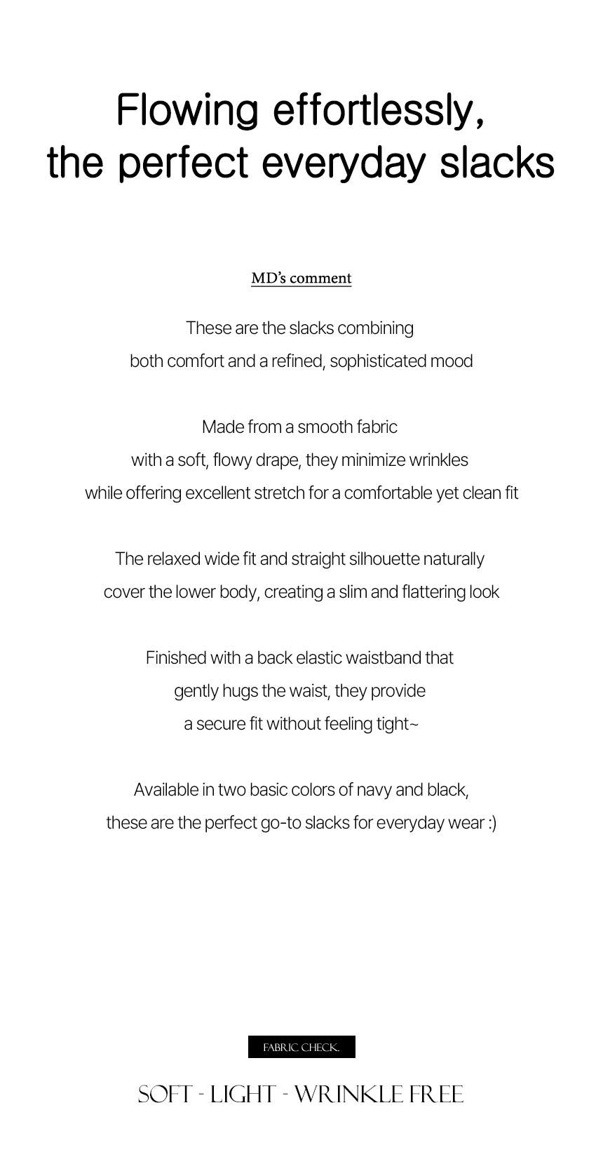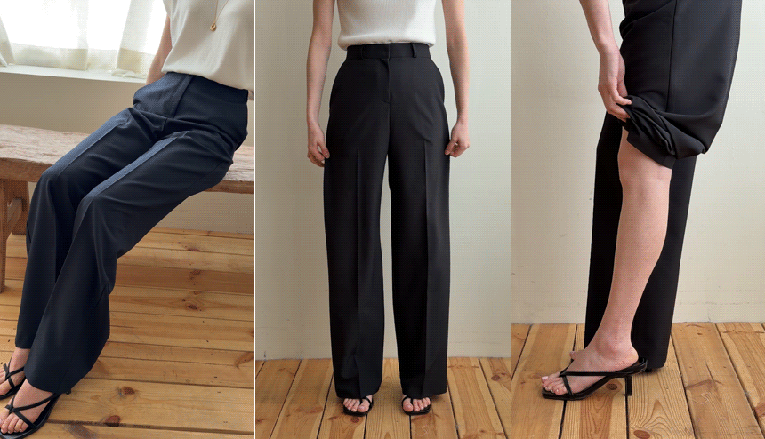 These are the slacks featuring a sleek fabric and a flowing fit! They offer a comfortable fit with an elastic waistband at the back and are wrinkle-resistant, making them perfect for everyday wear!