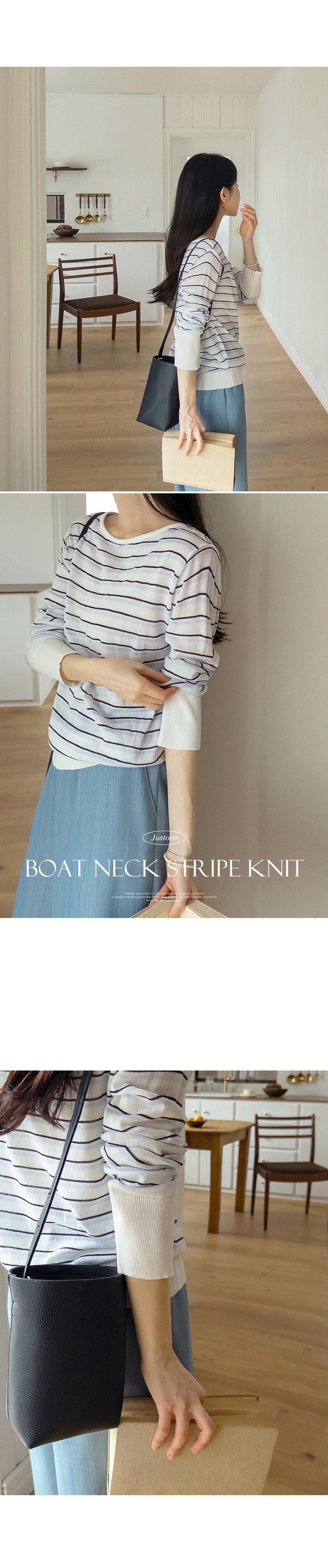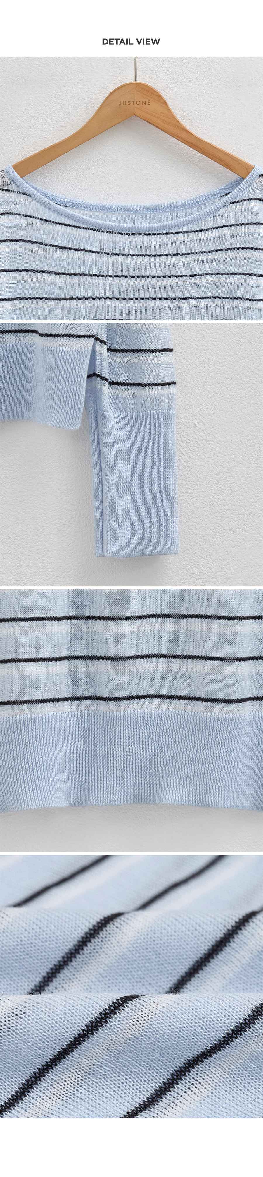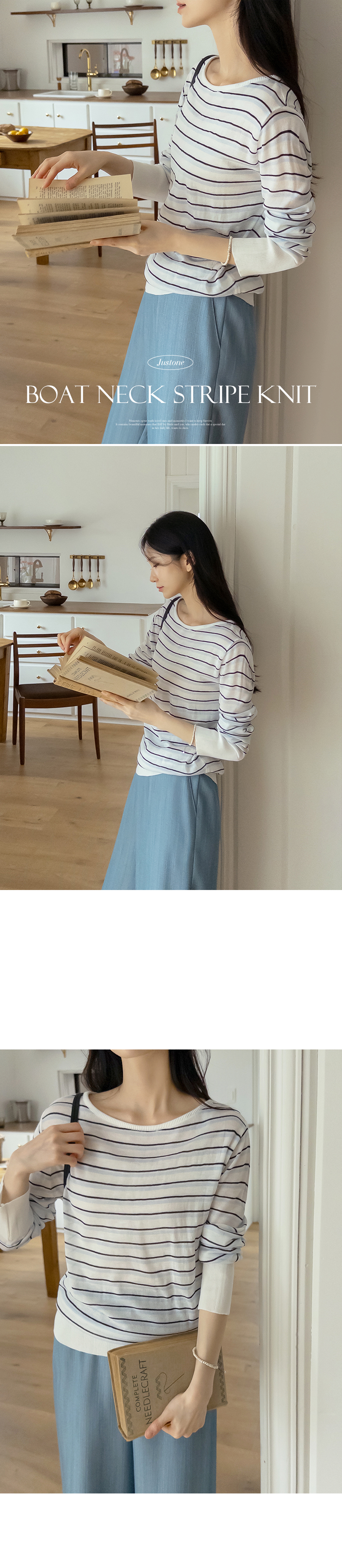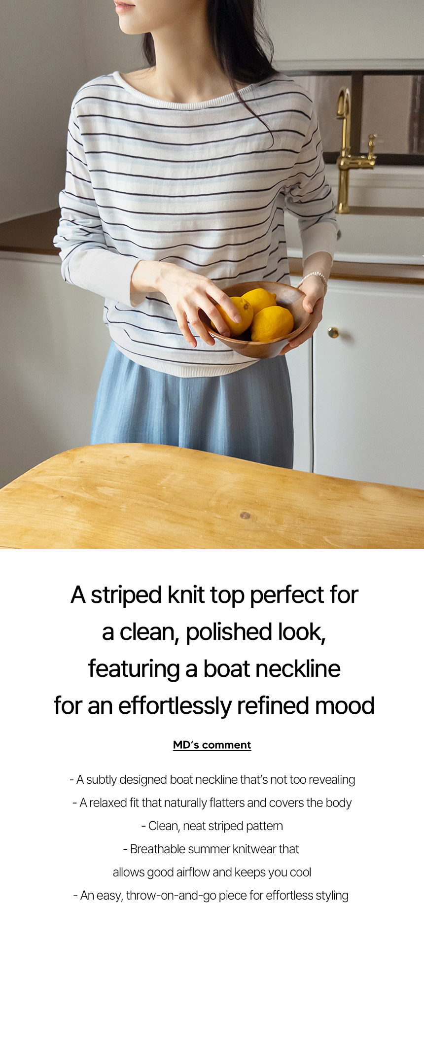 This knitwear features a gently flared boat neckline that highlights the collarbone, a subtle stripe pattern for a stylish touch, and a lightweight, breathable fabric that makes it perfect even for midsummer wear.