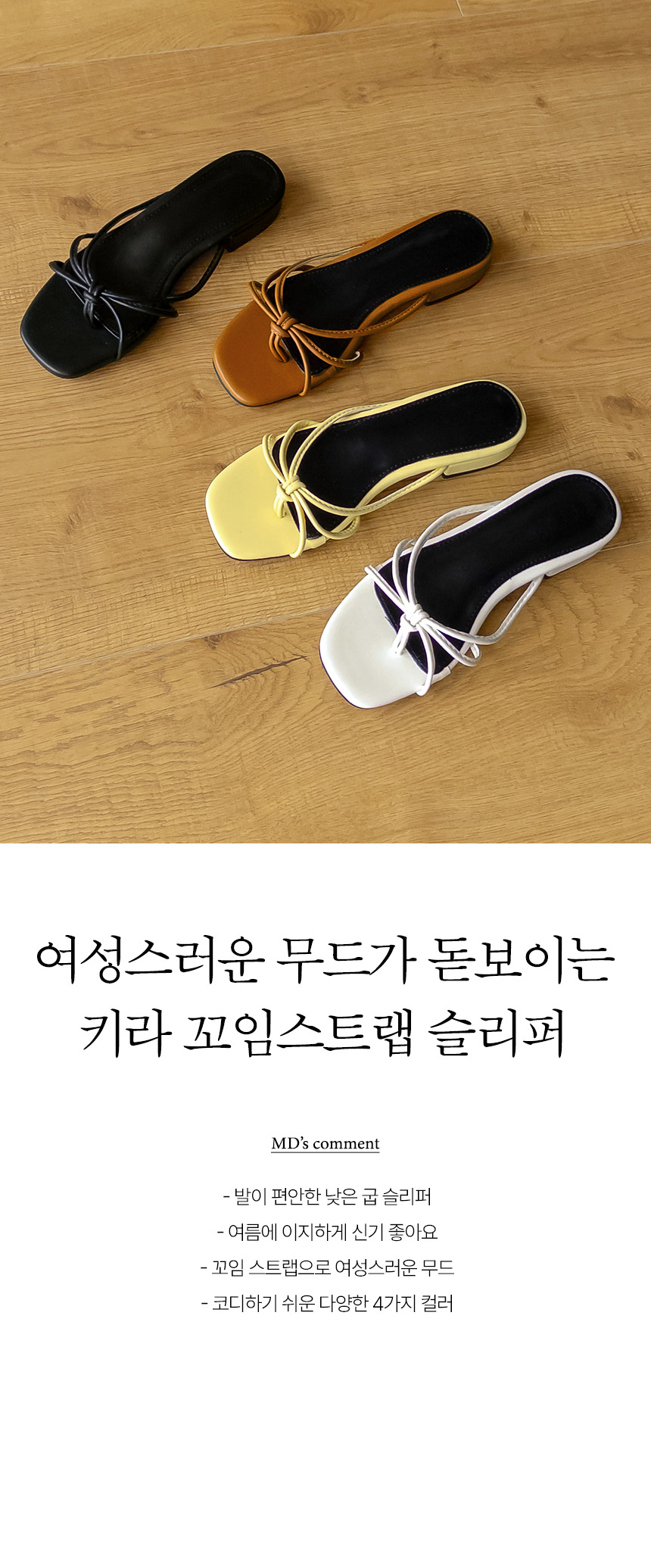 These low-heeled sandals are perfect for comfortable summer wear. The twisted straps add a subtle feminine touch, making them easy to style with skirts. Available in four colors.
