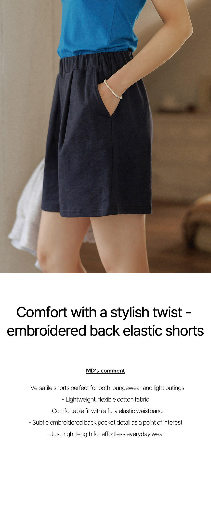 These easywear shorts feature delicate back embroidery for a subtle, charming detail. Made from lightweight, flexible cotton with a fully elastic waistband, they offer a comfortable fit - perfect for everything from lounging at home to everyday casual looks.