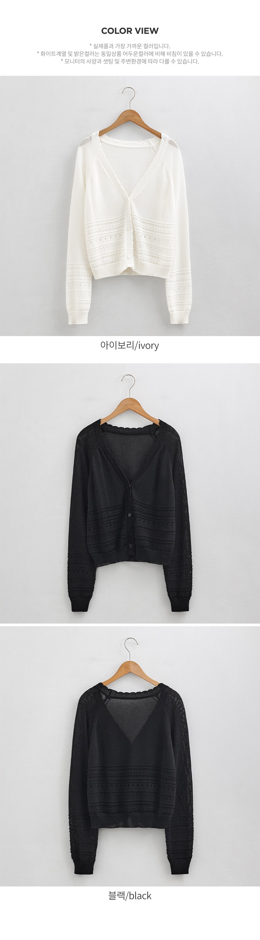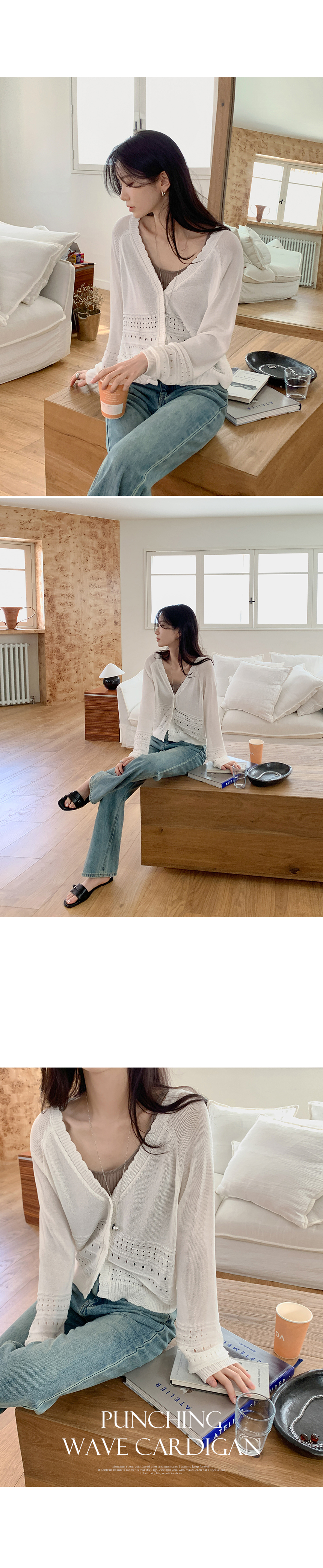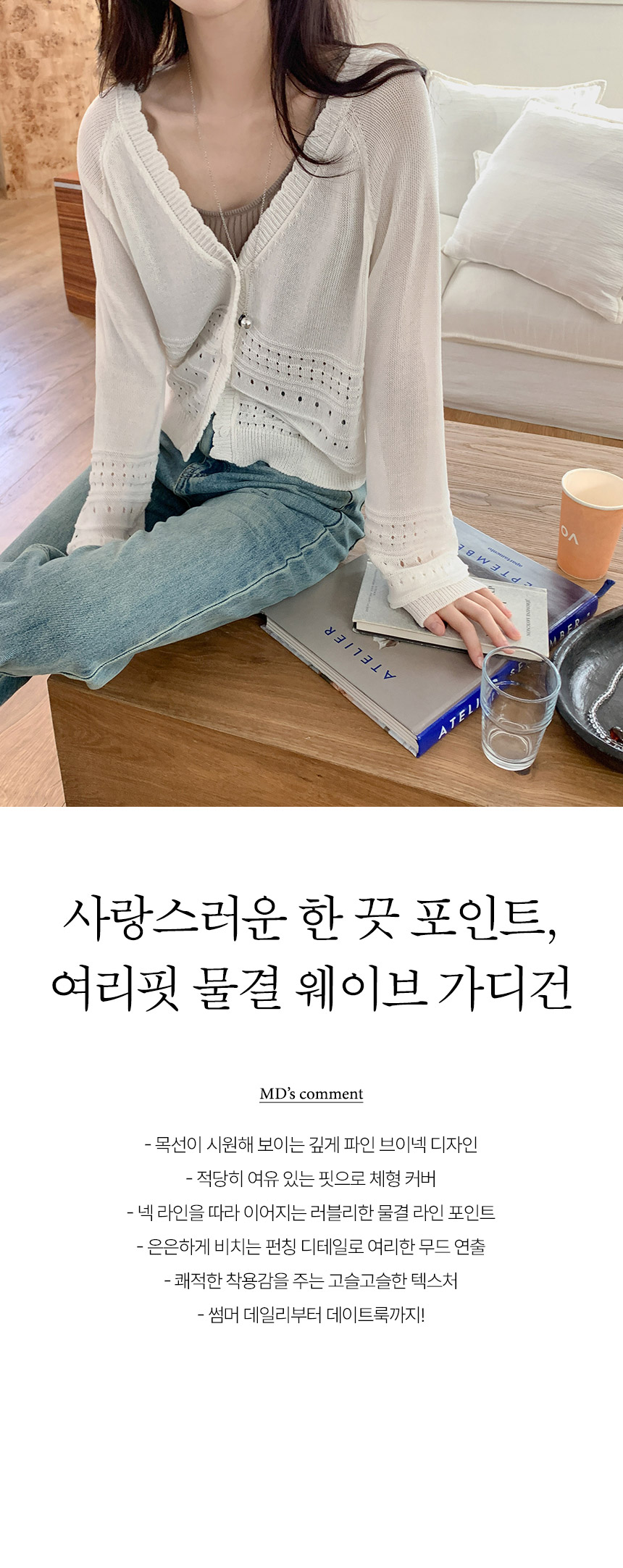 This cardigan features wave and punched detailing that adds a feminine touch. Made from a crisp, lightweight fabric, it’s perfect for light layering in the summer sun or in air-conditioned indoor spaces :)