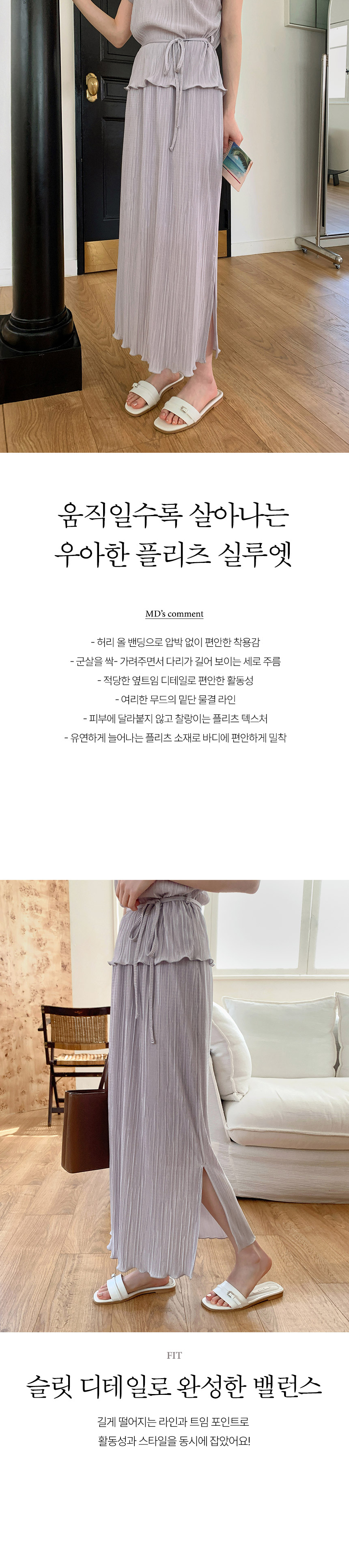 This skirt becomes even more beautiful with movement. Designed with a side slit and an elastic waistband, it offers both comfort and ease of wear. The delicate color palette adds a refined, luxurious touch to the overall look.