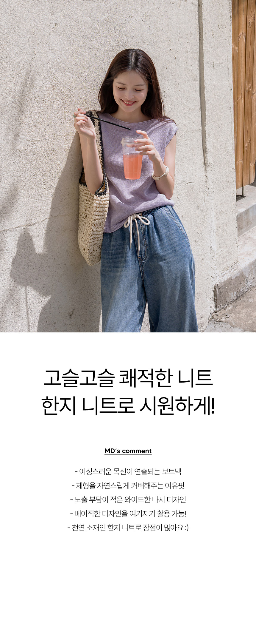 Experience the unique, "crispy" texture of natural Hanji knit. This eco-friendly material is exceptionally breathable and moisture-wicking, ensuring you stay fresh and dry even in tropical humidity. • Elegant Feminine Boat-Neckline 🦢The wide, sophisticated boat-neck design beautifully highlights the collarbone and neck, offering a refined look that balances modesty with modern K-style elegance. • Effortless Wide-Shoulder Coverage 🛡️Thoughtfully designed with a wider sleeveless cut to provide comfortable coverage and a relaxed fit that naturally drapes over the body for a slimming, carefree silhouette. 📋 Product Essentials