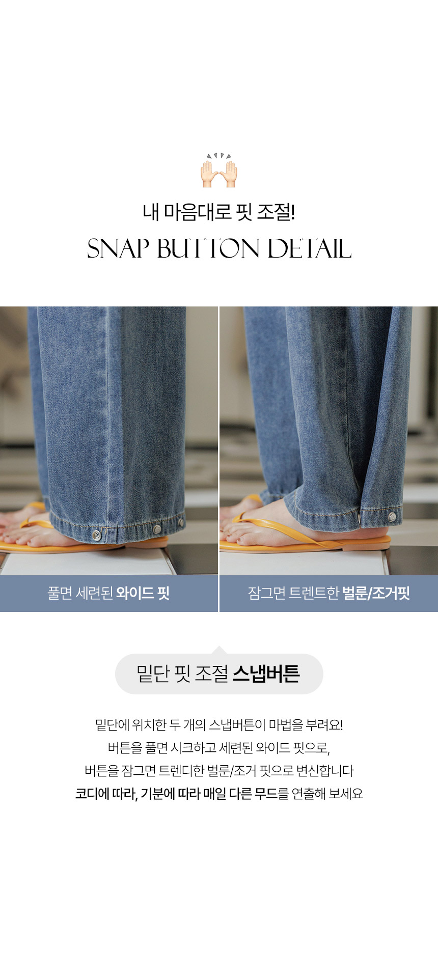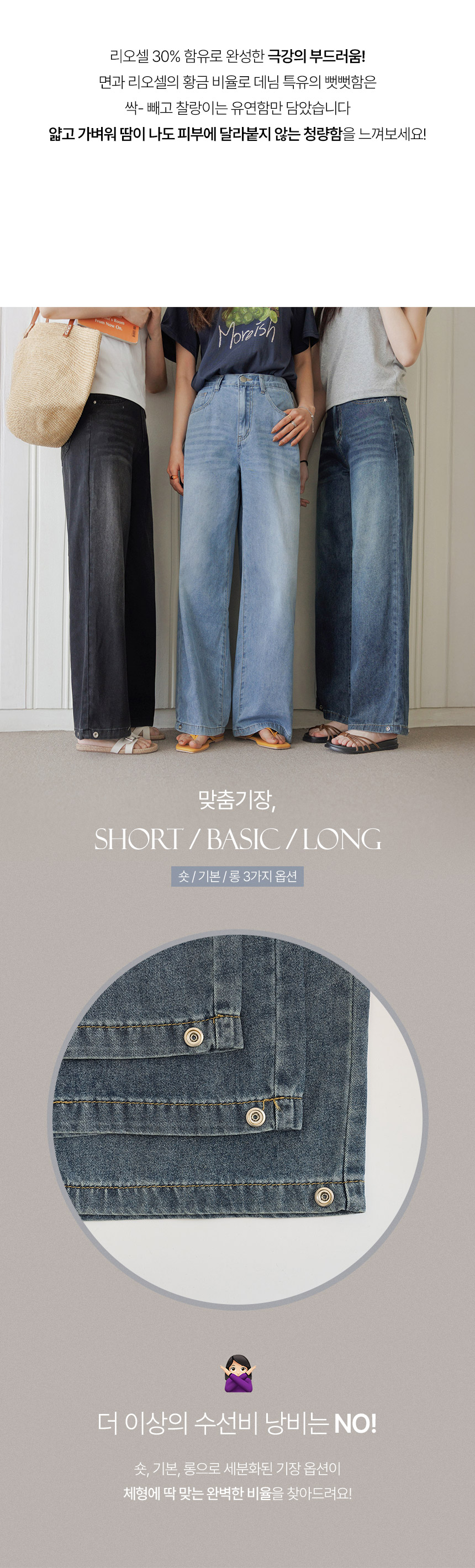 Forget heavy, stiff denim. Infused with 30% premium Lyocell, these pants offer a silk-like fluidity and cooling sensation that won't cling to your skin even in peak humidity. • Dual-Silhouette Snap Buttons 🔄One pair, two moods. Keep the hem open for a sophisticated wide-leg look, or use the signature snap buttons to create a trendy balloon/jogger fit in seconds. • Tailored Length Selection 📏No more alteration trips. Choose from Short, Basic, or Long options to find your perfect proportions, complemented by a hidden elastic waistband for effortless comfort. 📋 Product Essentials
