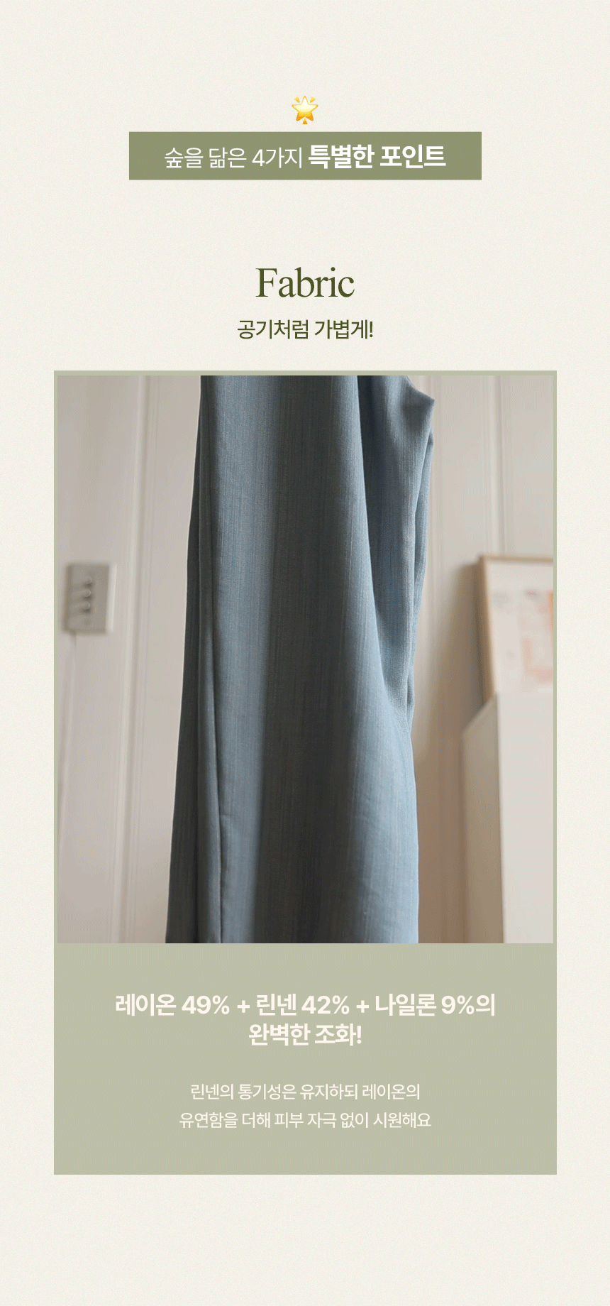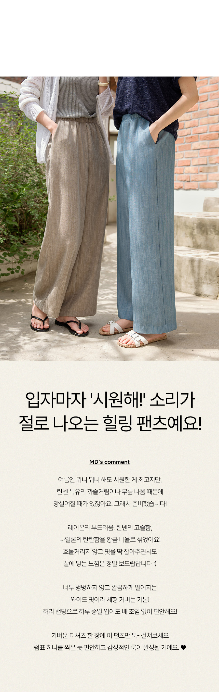 Expertly woven with 49% Rayon, 42% Linen, and 9% Nylon. Experience the natural crispness of linen without the scratchiness, blended with rayon’s silk-like softness and nylon’s resilient durability. • All-Day Comfort Banding ☁️Featuring a flexible full-elastic waistband that moves with you. Whether you’re sitting for long hours or exploring the city, enjoy a pressure-free fit that feels light as air. • Sculpted Wide-Straight Silhouette 📐The fit is designed to discreetly camouflage lower body concerns while elongating your legs. It drops in a clean, sophisticated line for that coveted "Effortlessly Chic" look. 📋 Product Essentials