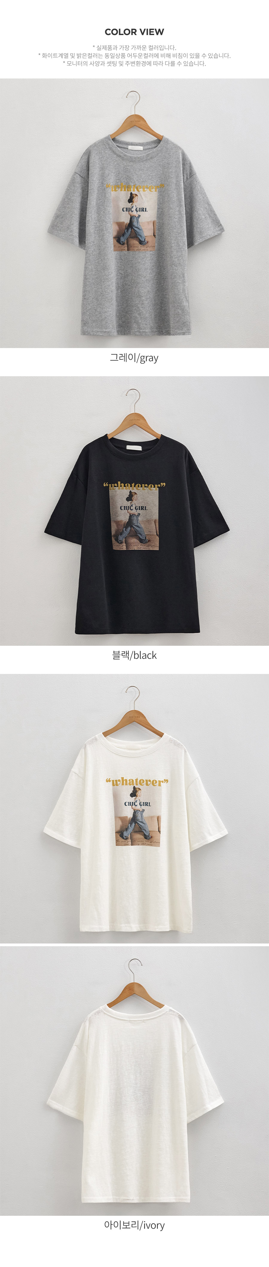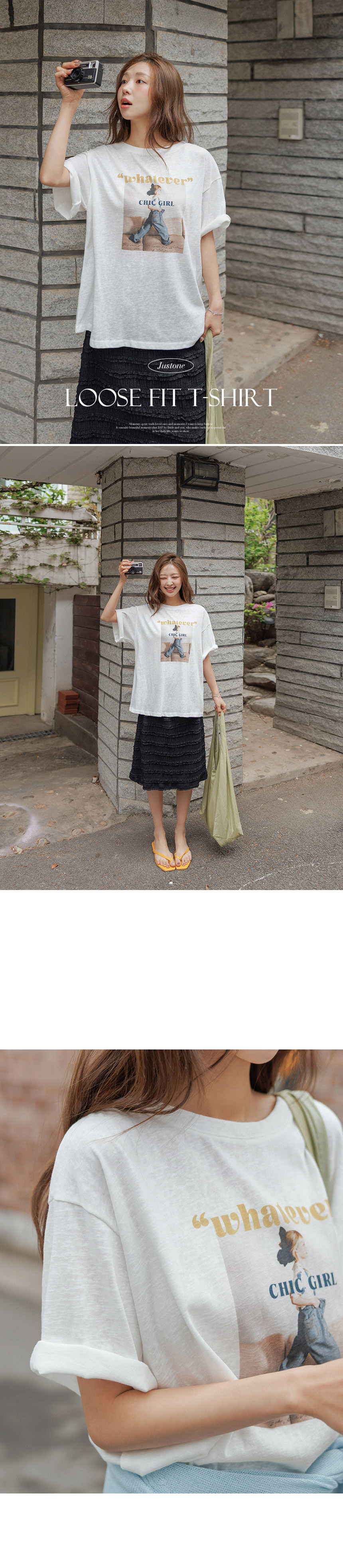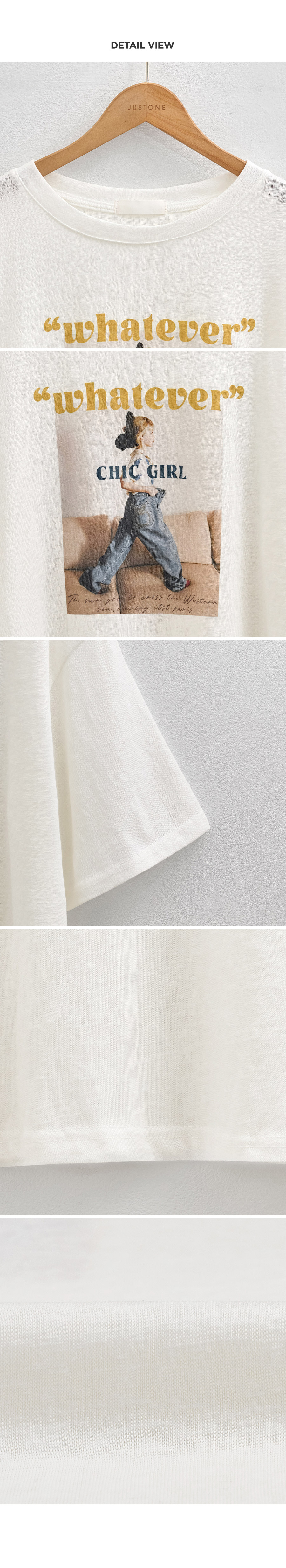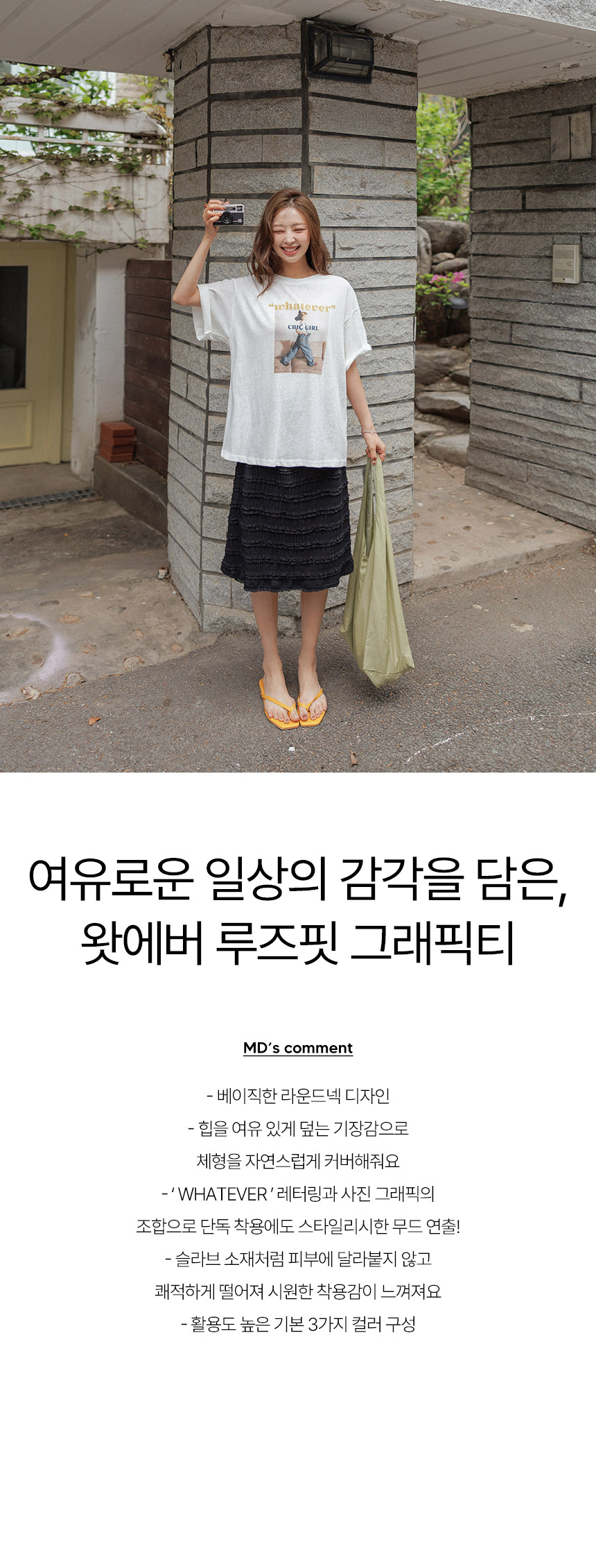 Designed with a generous length that comfortably covers the hips, providing a natural and flattering fit for any body type. • Artistic Graphic Fusion 🎨The perfect harmony of 'WHATEVER' lettering and a cinematic photo print creates a stylish, stand-alone mood without the need for complex layering. • Cool-Touch Slub Texture ☁️Crafted from a premium slub-like fabric that doesn't cling to the skin, ensuring a crisp, airy, and refreshing feel even on warmer days. 📋 Product Essentials